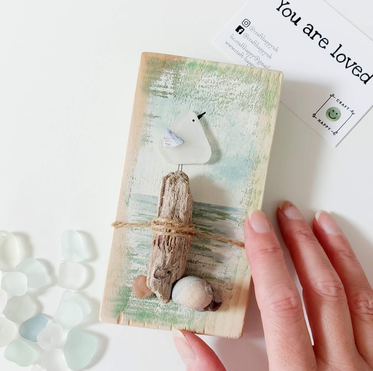 It makes sense to me to create cute and quirky coastal scenes using pieces of pottery and sea glass that I find on the beach. Maybe this is because I live in the Midlands and I yearn for the seaside? I am inspired by the colours of the sea glass when I paint my pieces and I love being able to recreate this in the unique pieces I craft.