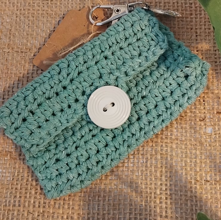 Handmade Crochet Keychain Wallet Pouch Mini Card Holder Key Bag Teal Case Button