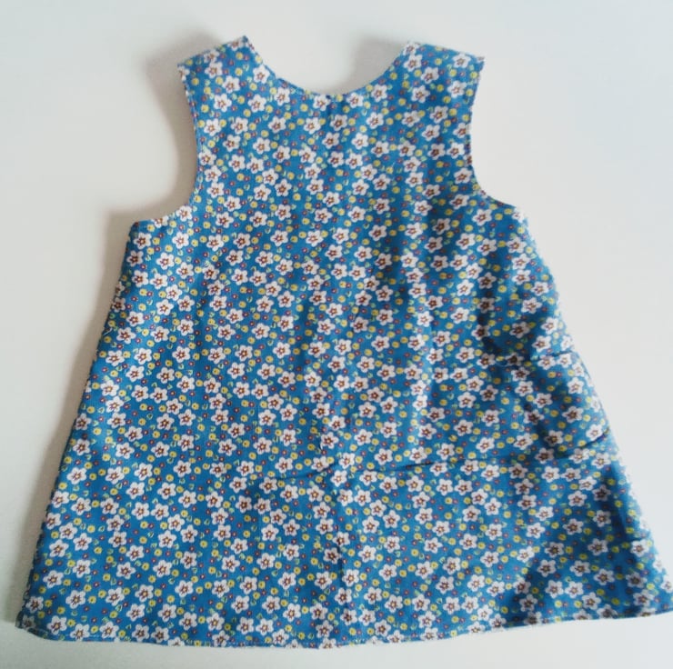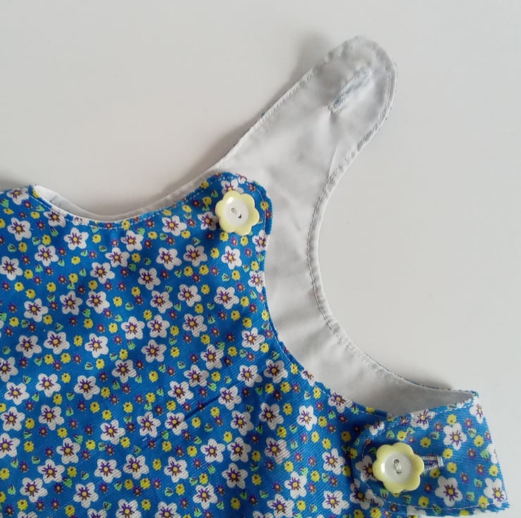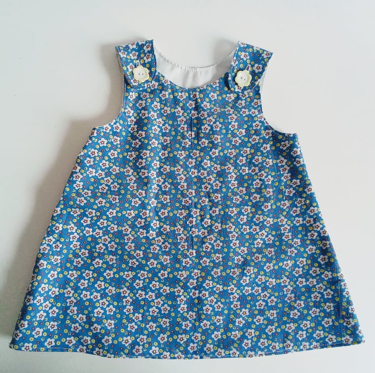 A line style dress/pinafore in blue needlecord with a floral print design. With a white polycotton lining.