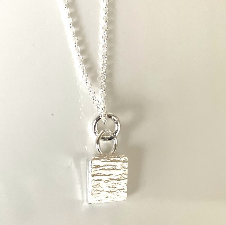 A dainty hand hammered and reticulated square of solid 925 sterling silver. The square is 1 cm diameter and hung on a beautiful diamond cut, 18 inch belcher chain.