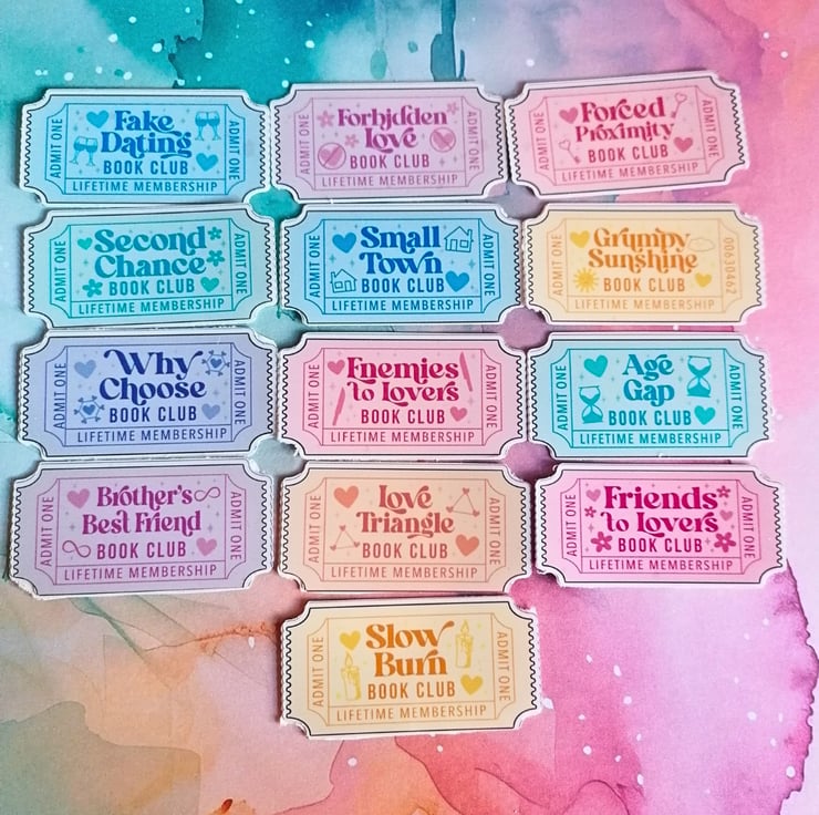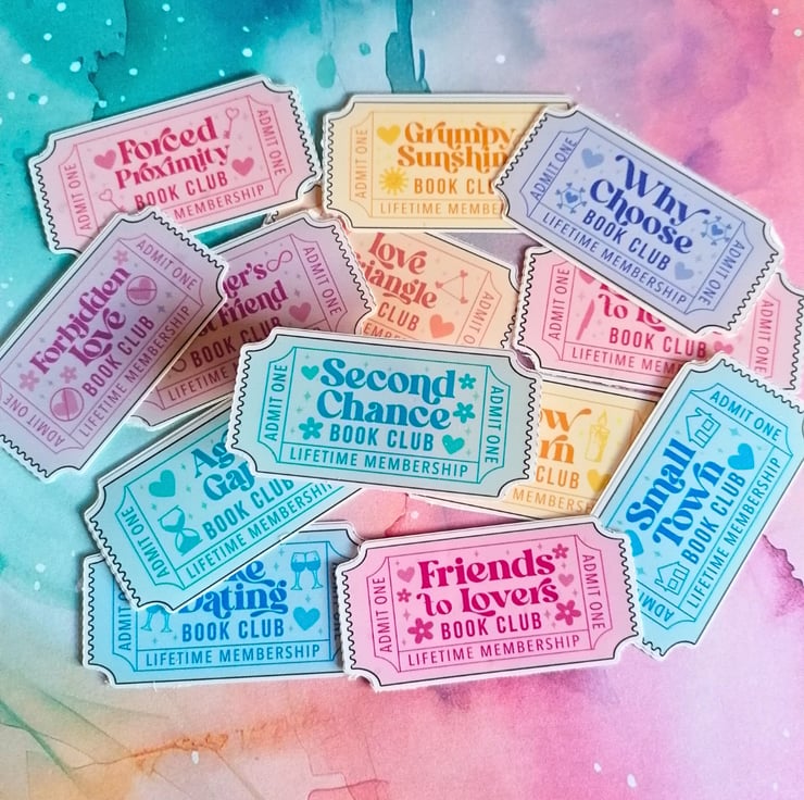 'Book Club' glossy vinyl sticker. Little book club tiskets with various tropes and genres. Made with quality vinyl sticker paper and a clear laminate for extra protection and durability. This sticker can be stuck on anything you like, including laptops, Kindles, books, and windows - anything! Suitable for indoor and outdoor use.
