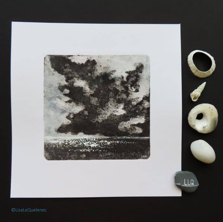 Storm cloud, atmospheric coastal scene in black and white mixed media.