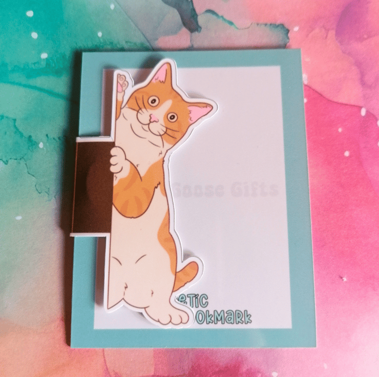 Peeking kitty, glossy Magnetic Bookmark. Cute kitty peeking round the side of your pages. Printed on glossy photo paper and laminated for additional protection. Weatherproof, tear-resistant and durable. Featuring the same design on the front and back, allowing you to flip the orientation of the design. Approximately 1.5 x 3.25 in.