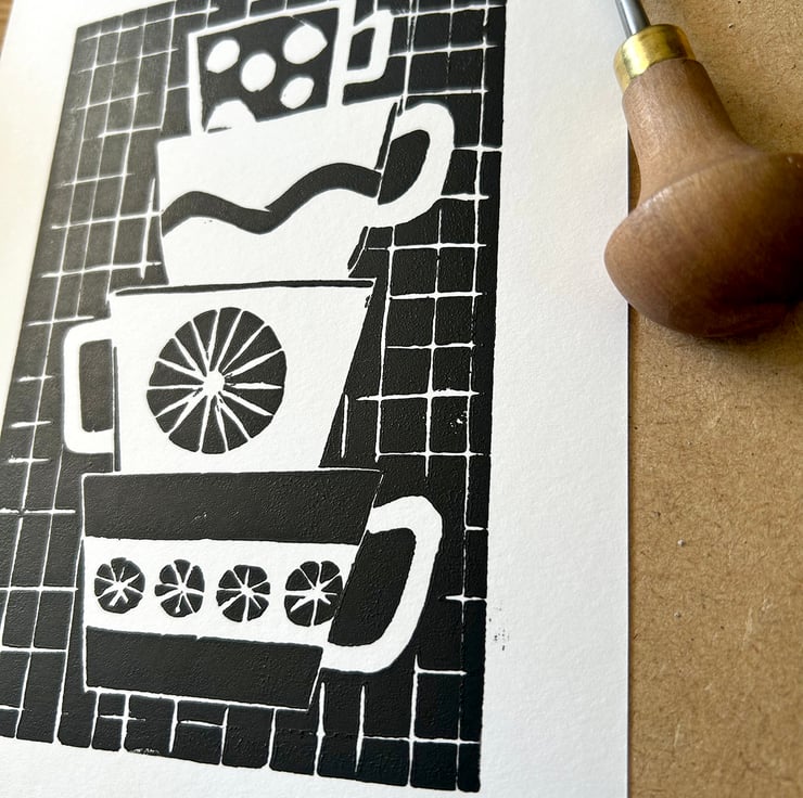 This original black and white linoprint would make a great addition to your own kitchen decor or a wonderful gift for a lover of everything retro!
