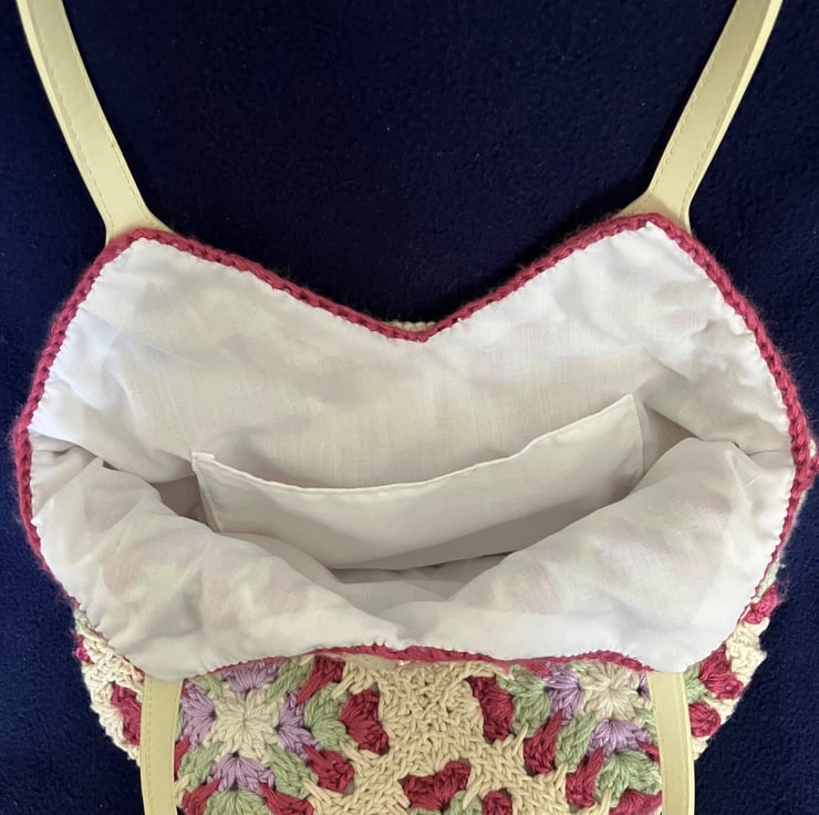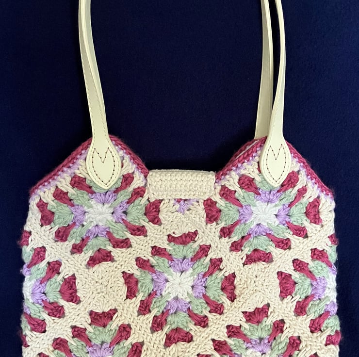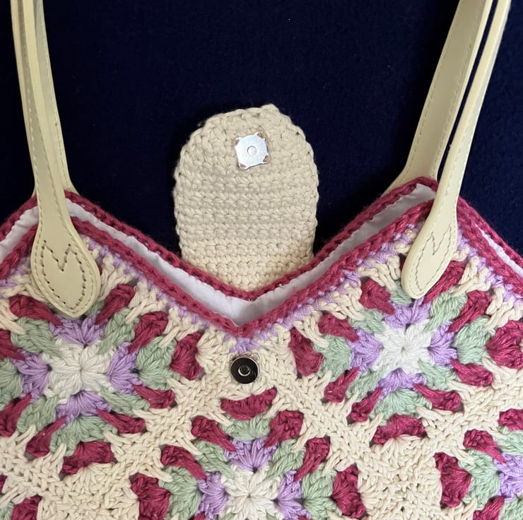 The crochet square as a distinctive stitch design and the yarn used is cotton Aran weight, this means the bag will hold its shape and be durable.