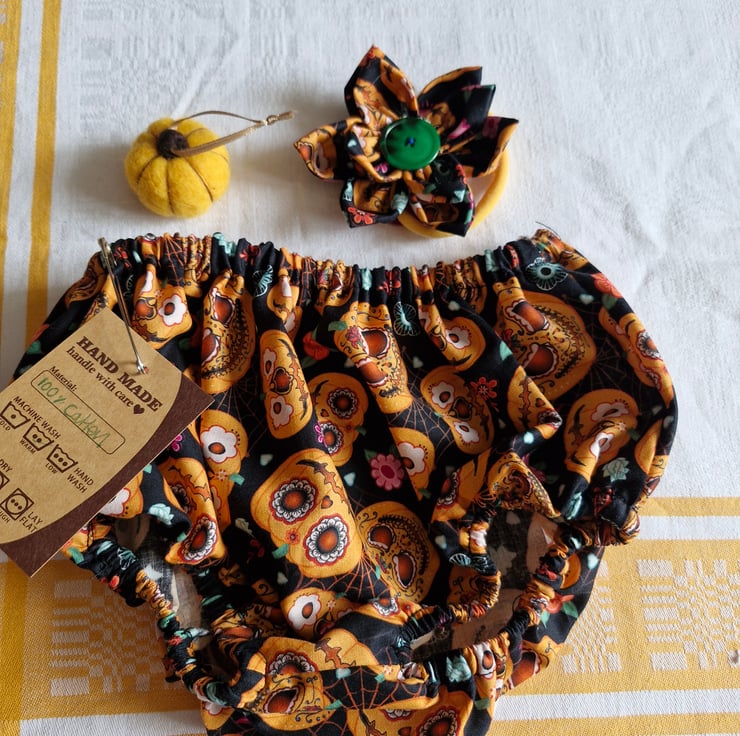 Meadowbelle's bloomers are the perfect blend of comfort and cuteness for your little one. made from soft, breathable cotton fabric, these bloomers are designed to be roomy and accommodates disposable nappies, while the gentle elastic waistband and leg openings ensure a snug but comfortable fit without irritation. This pair has a cute pumpkin pattern perfect for Halloween. Would look great over some patterned tights. The sizes are a generic S M L. This pair is MEDIUM. washing suggestions provided. If you require something more specific we do offer a custom made service. Please message me with your requirements.