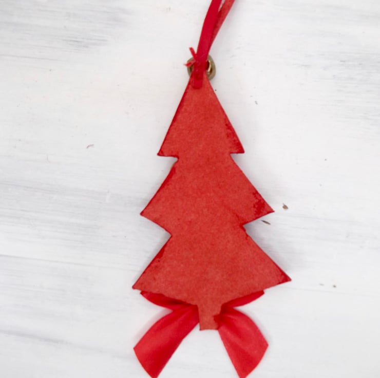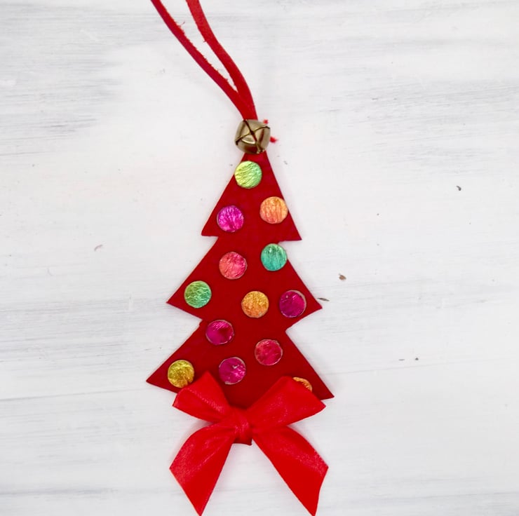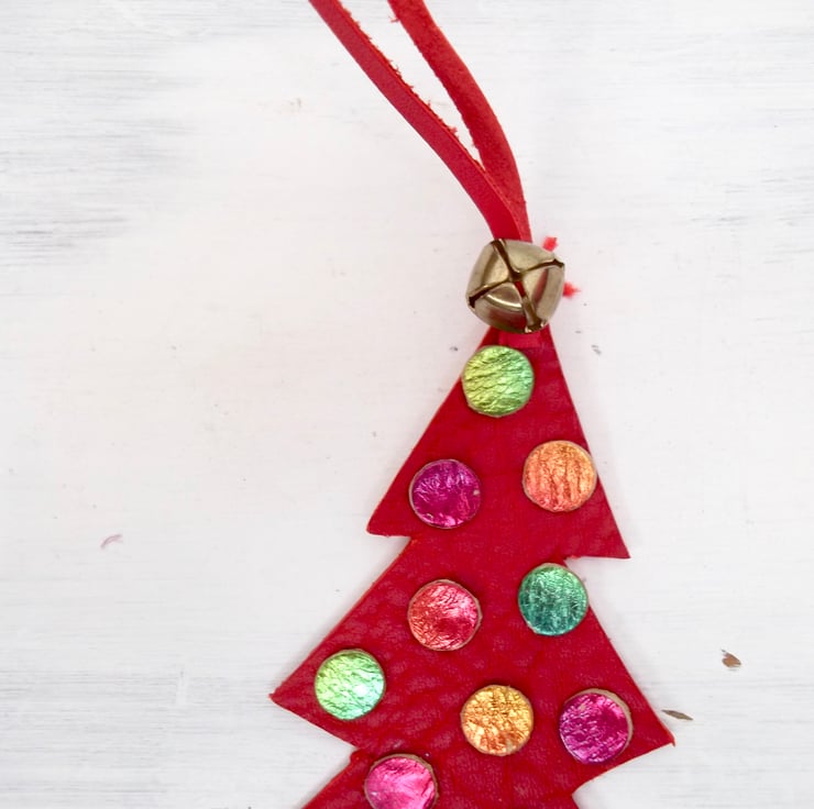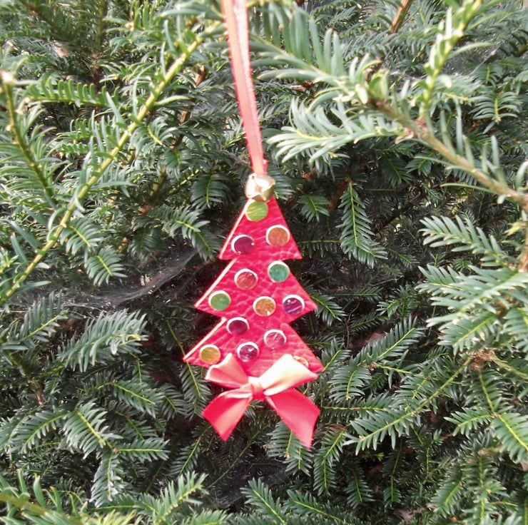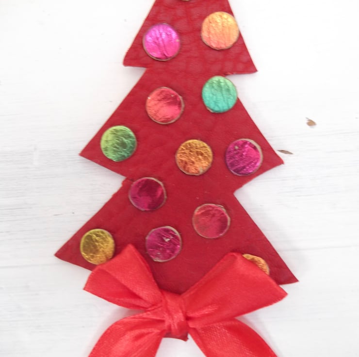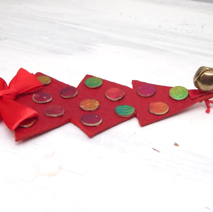 Hand cut tree shape from red bovine leather with round baubles that have been glued on. The baubles are made from real leather which has been covered in a metallic rainbow-coloured foil so they have a little shine to them. Red fabric bow at the bottom, a gold coloured metal bell at the top of the tree and a red leather hanging strip. Natural marks in the leather