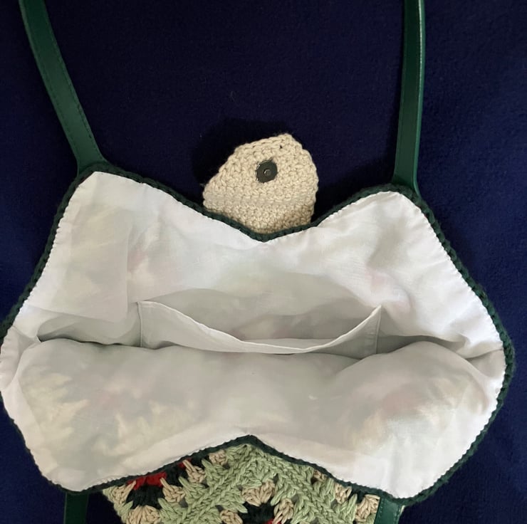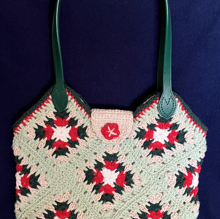 The crochet square as a distinctive stitch design and the yarn used is cotton Aran weight, this means the bag will hold its shape and be durable.