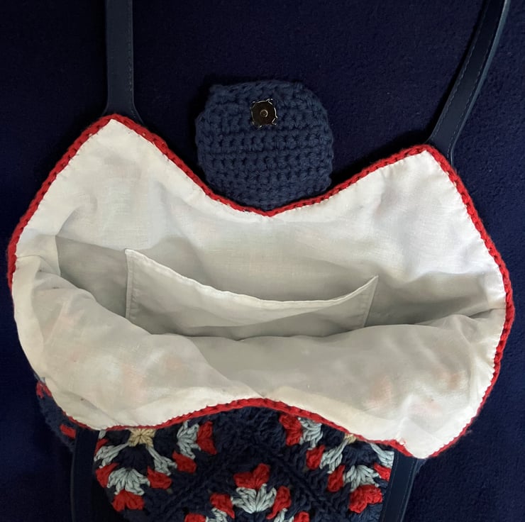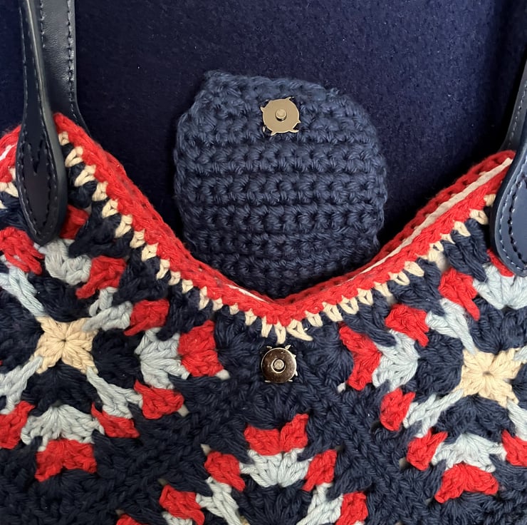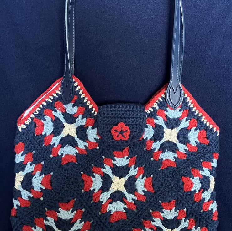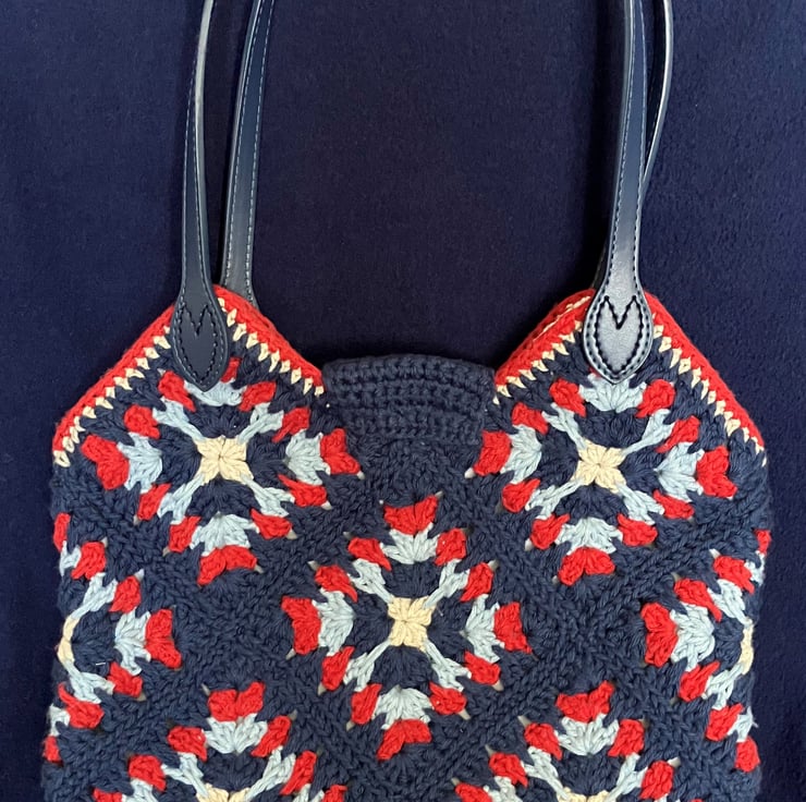 The crochet square as a distinctive stitch design and the yarn used is cotton Aran weight, this means the bag will hold its shape and be durable.