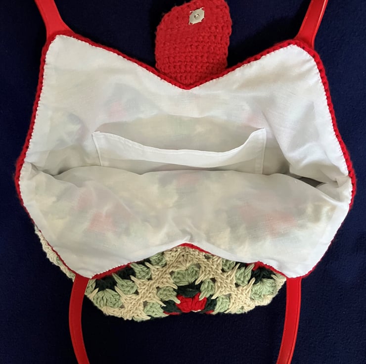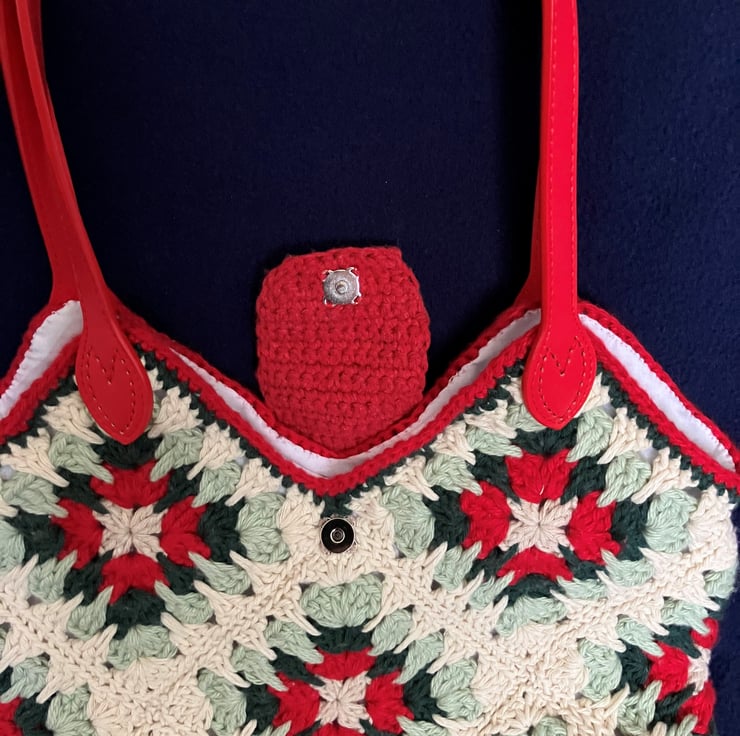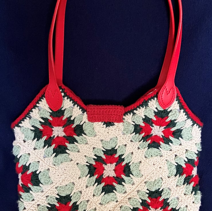 The granny tote bag has been given faux leather handles for extra strength, it can be hand held or used as a shoulder bag.