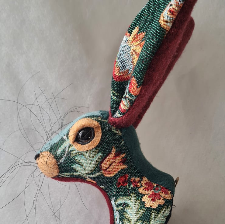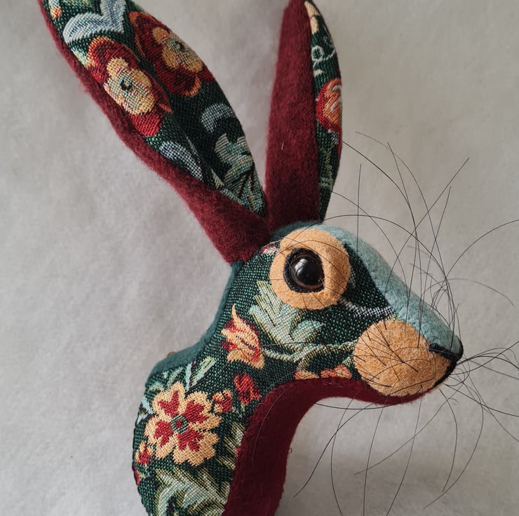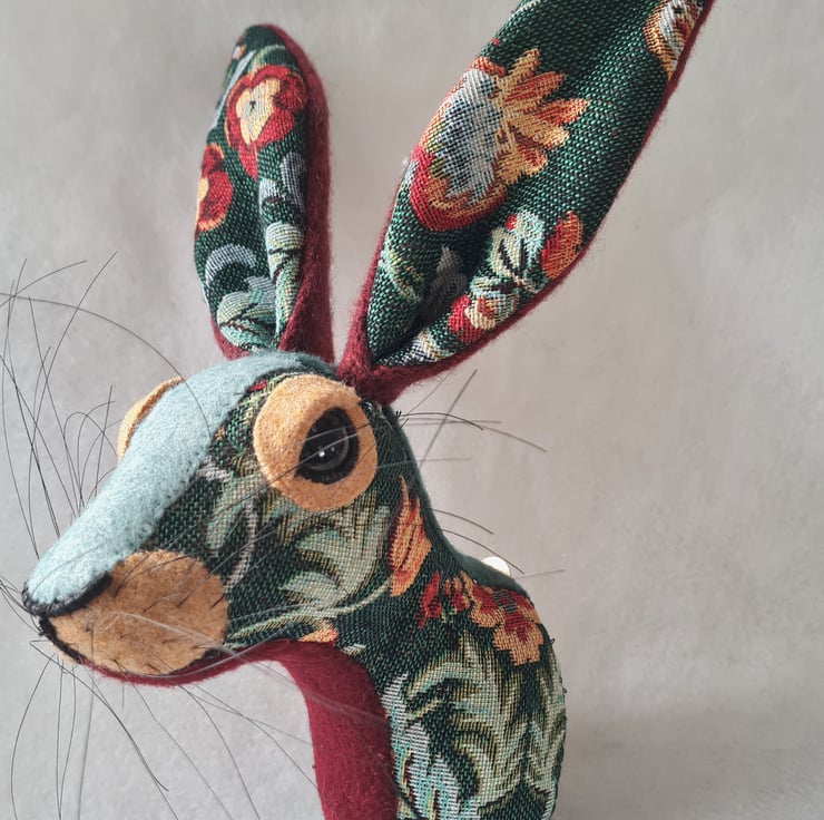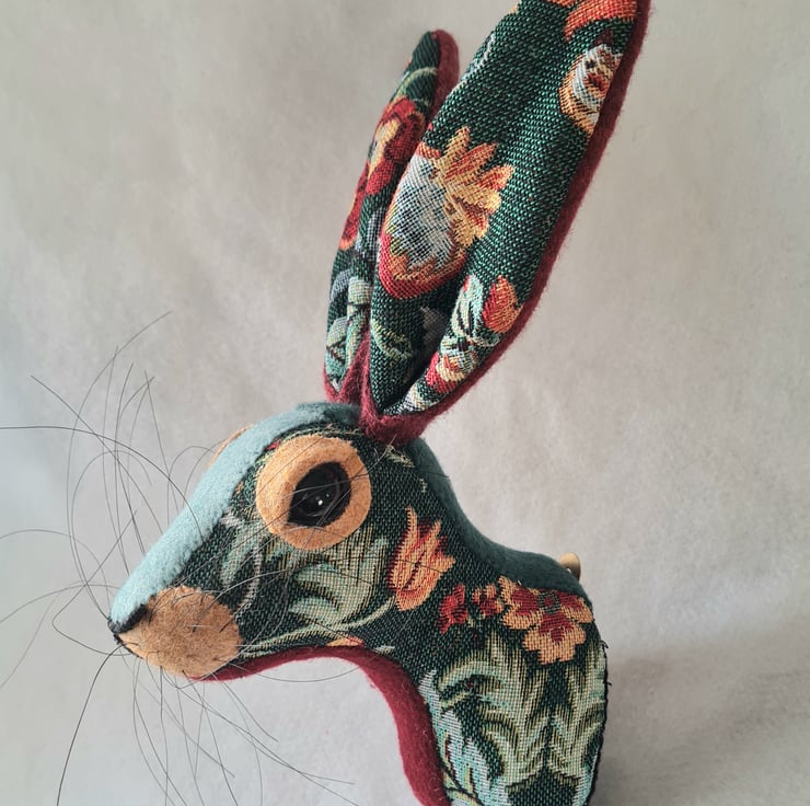 A lifesize faux hare which I have handmade and covered in hand stitched floral tapestryfabric. The head is backed with felt and has a metal hanger to hang it on the wall. It is lightweight.
