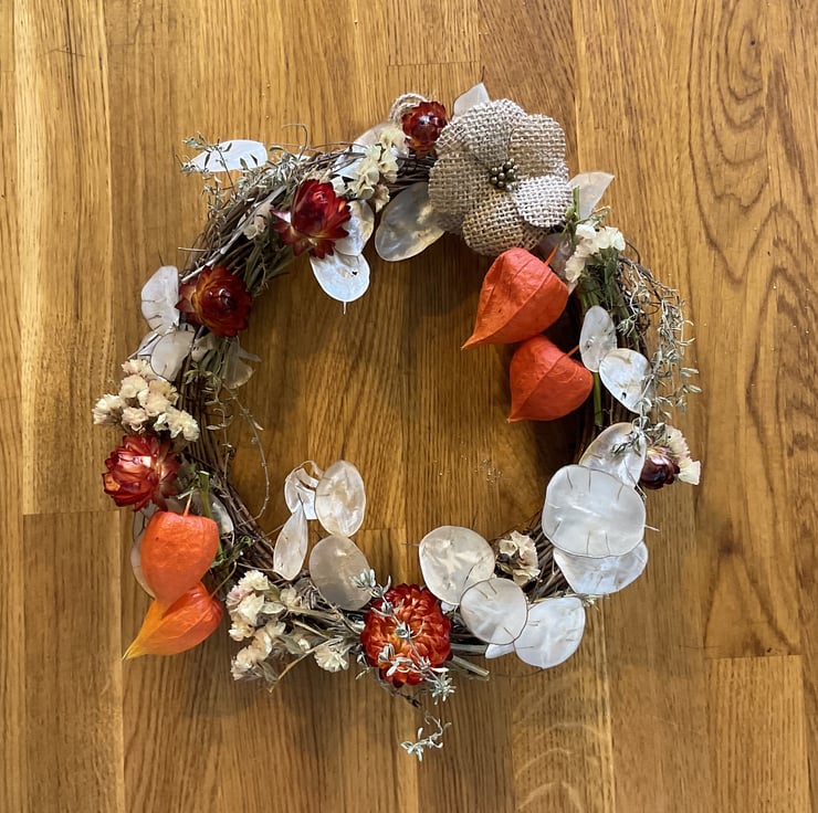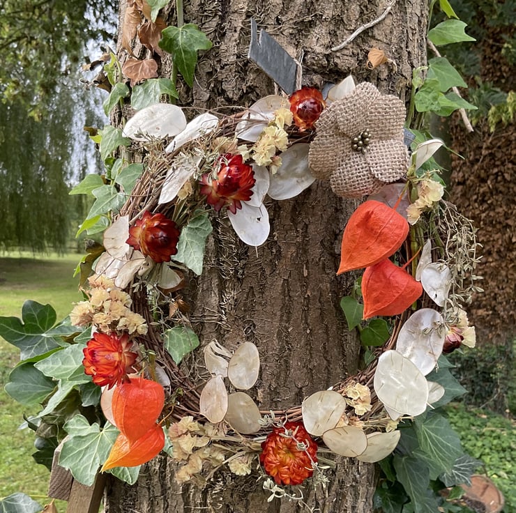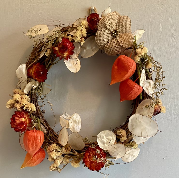 A one-off design to bring a little of the outdoors into your home this Autumn and Winter! This 20cm diameter wreath has been made from flowers grown and dried in my Suffolk garden and arranged on a woven vine twig base. There are burnt orange Helichrysums, Honesty, Statice and Chinese Lanterns. A hanging loop is attached.