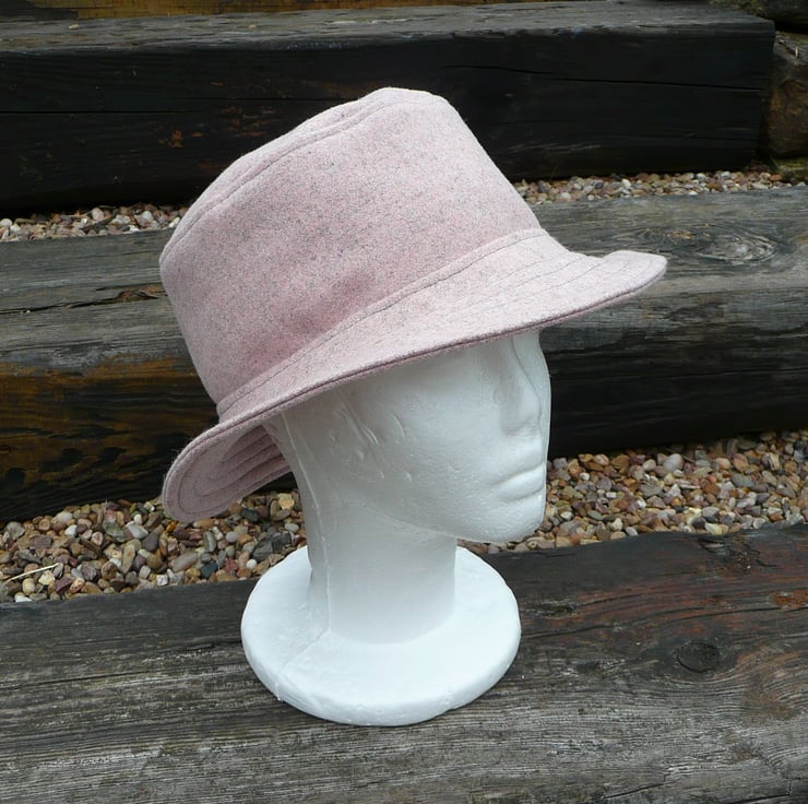 Bucket hat glove set pink grey marl wool tweed faux sheepskin fleece mittens