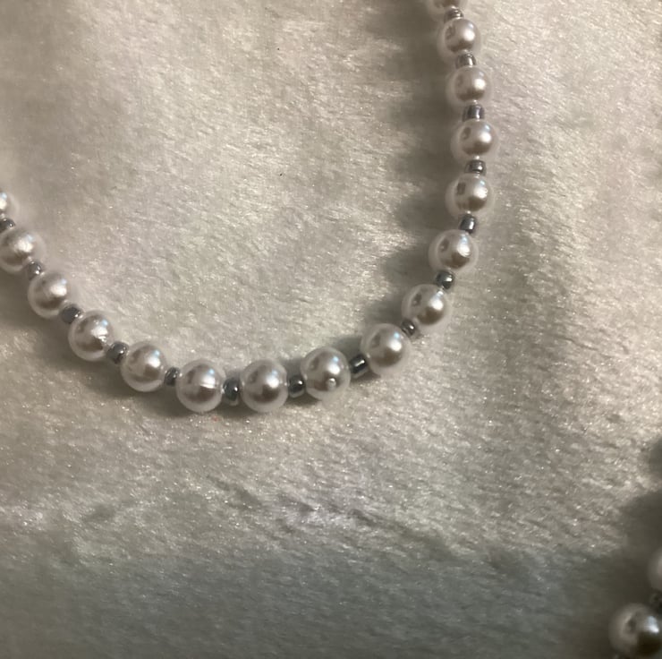 I’ve used white pearls with grey colours seeds beads and 20 mm White Rubber Connectors . always used Beadalon wire . Strand is the most flexible, the most durable.