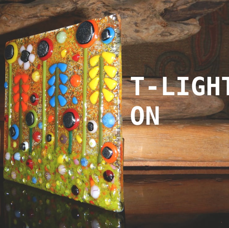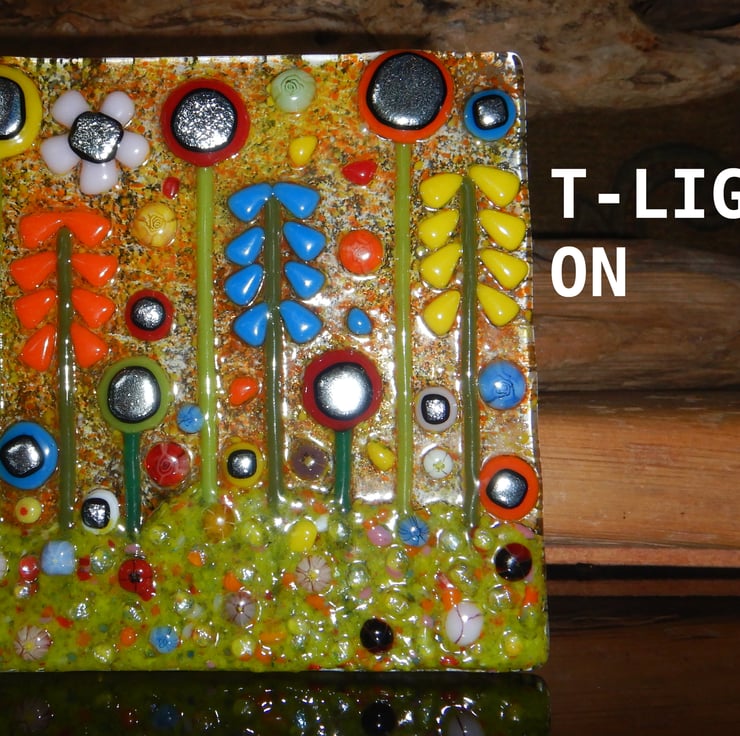 Lovely, bright, colourful, and cheerful T-light holder. Carefully made by myself using bullseye glass, dichroic glass, and frit glass. Each piece of glass was positioned carefully to make sure that the composition was balanced, and that it would have maximum visual impact.