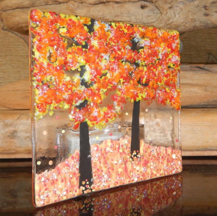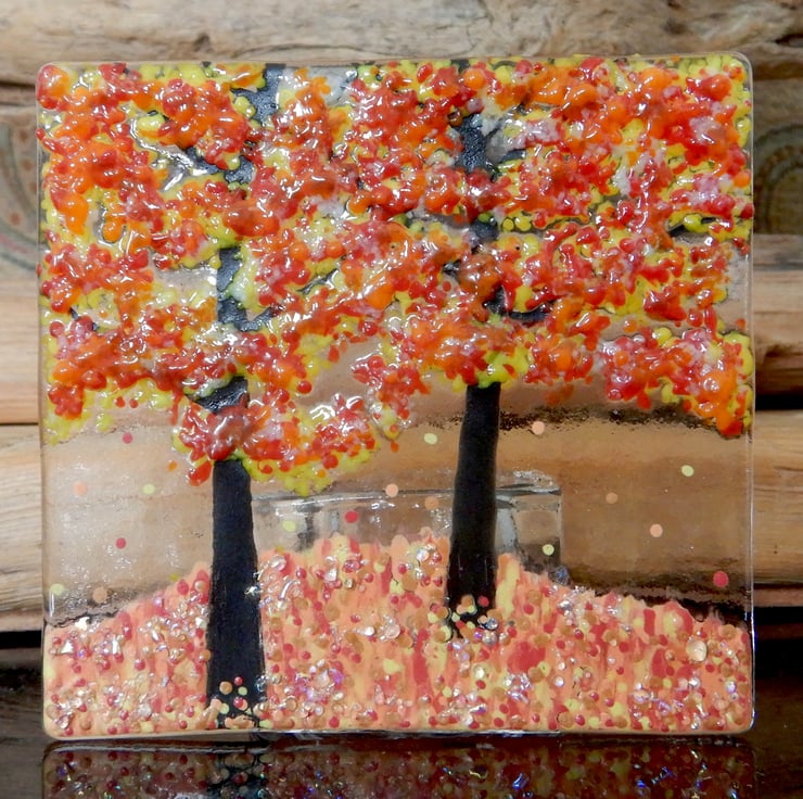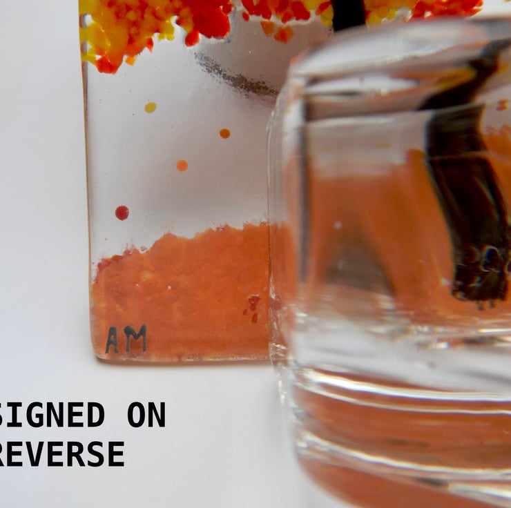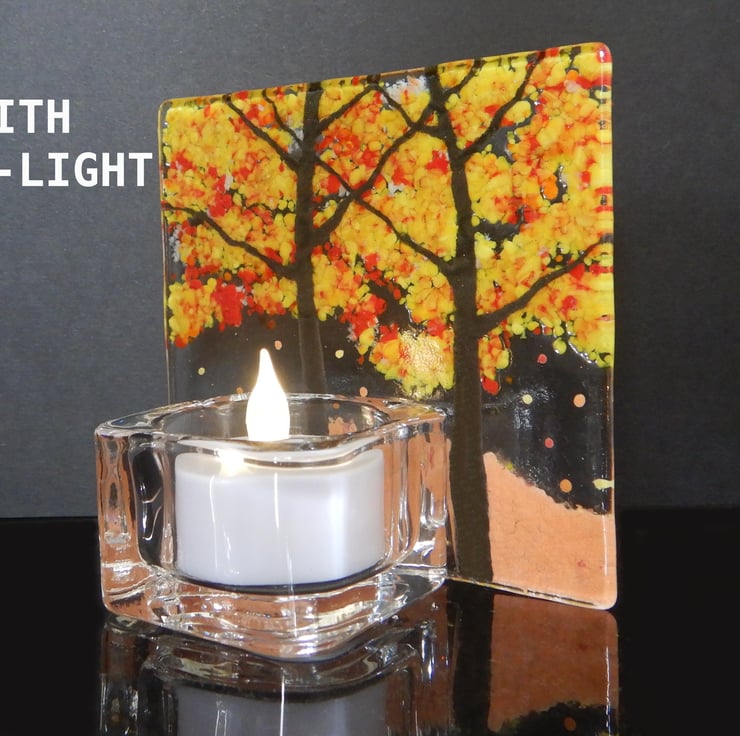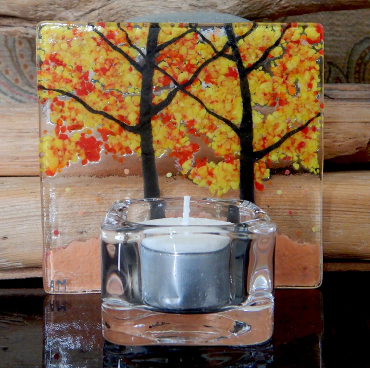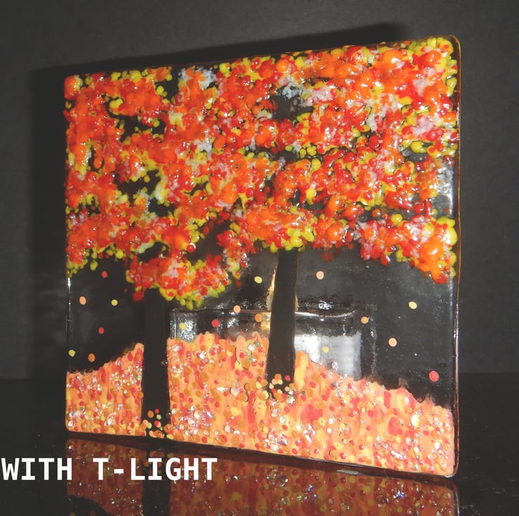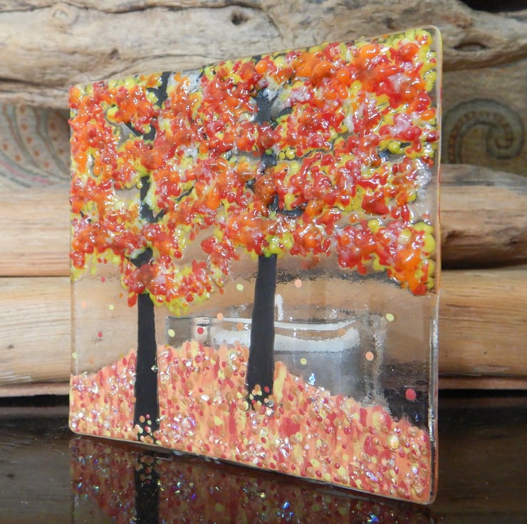 Handmade Fused Glass 'Autumn Tree' T-Light Holder.