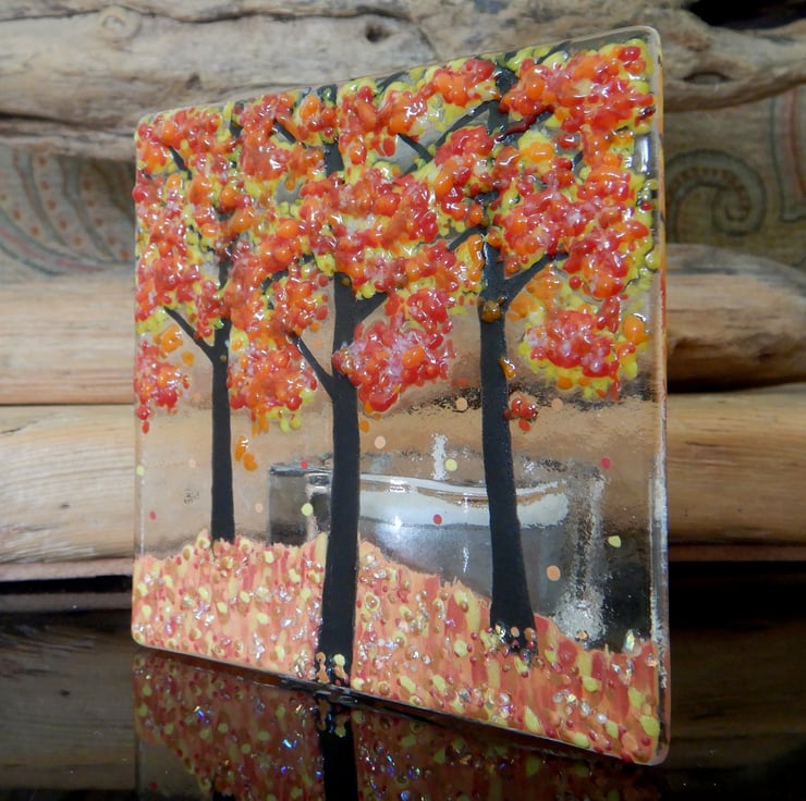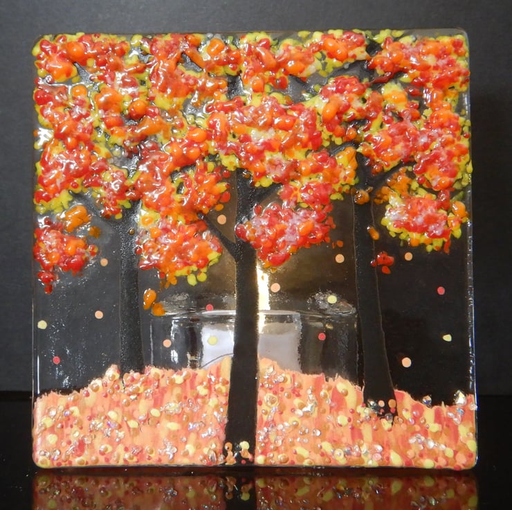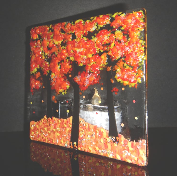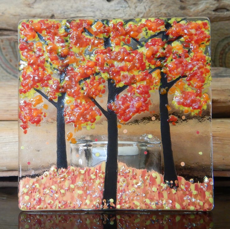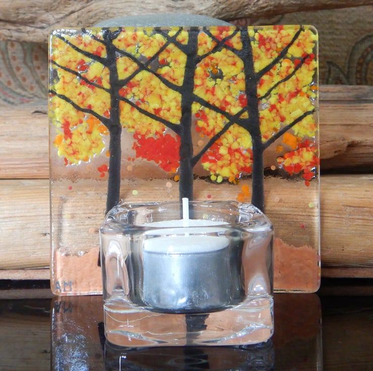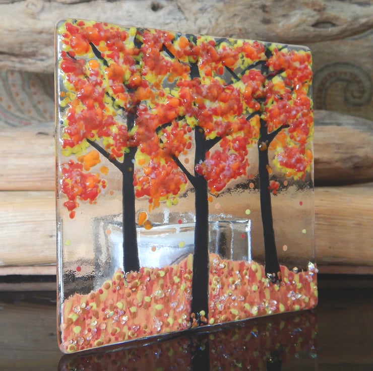Handmade Fused Glass 'Autumn Tree' T-Light Holder.