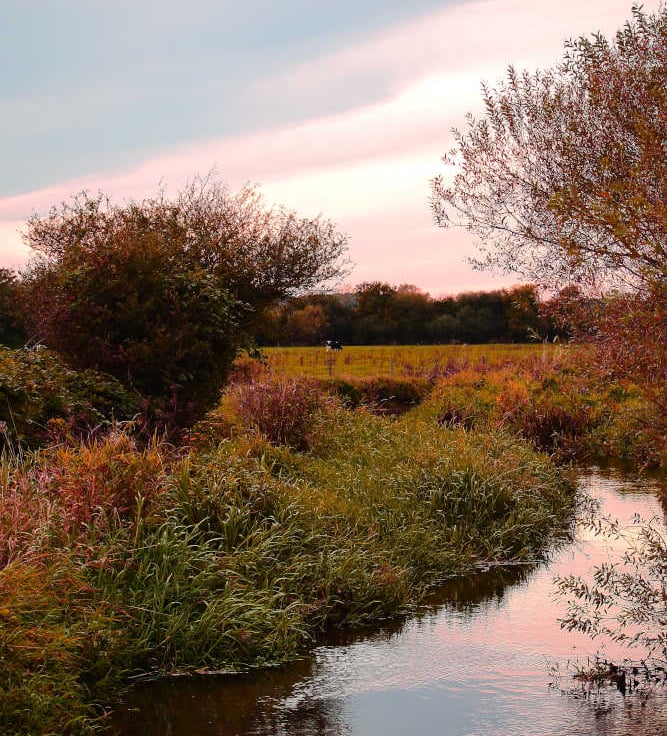 A photographic print of the Dorset Countryside, the River Frome running through the countryside near Dorchester.