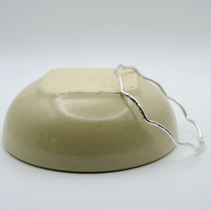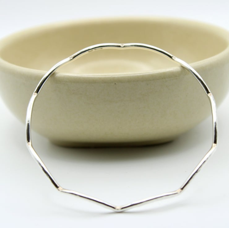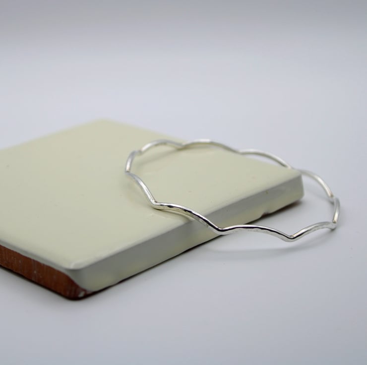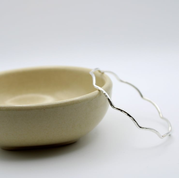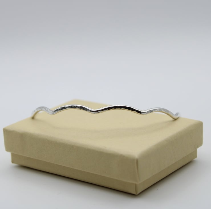 This wavy bangle is made from Solid Sterling Silver wire. There are 10 waves along the circumference of the bangle. The bangle has been hammer textured with the rounded end of a ball-pein hammer to reflect light and create an eye catching look.