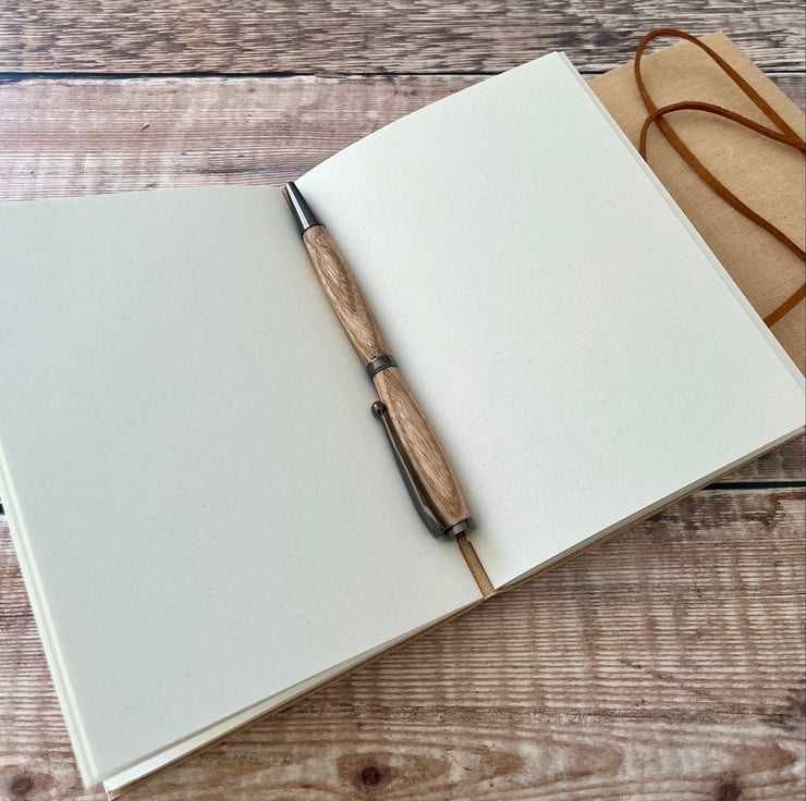 It is filled with 80 pages (160 sides) of high quality recycled paper, suitable for all writing and drawing mediums. It is tied with a purple faux suede cord.