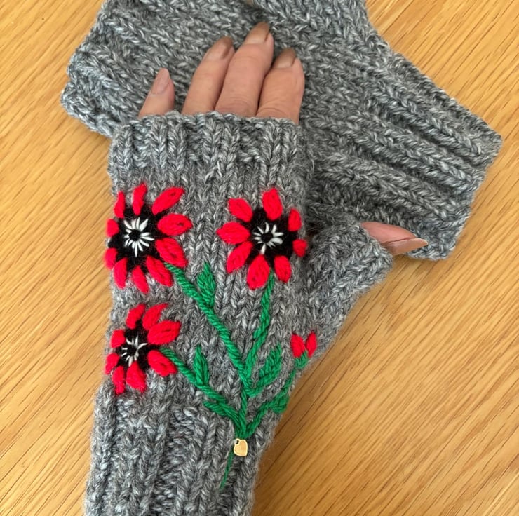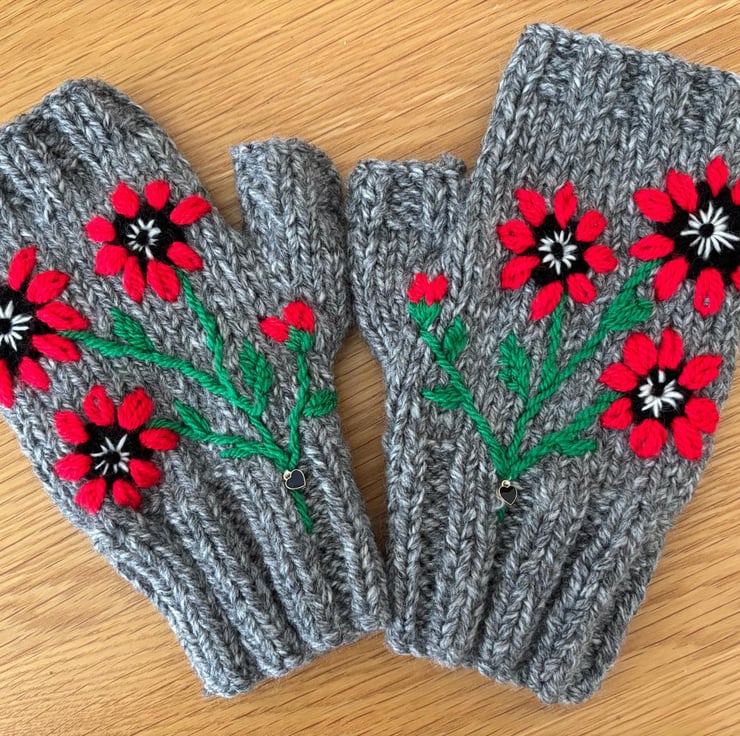 This is a pair of chunky hand knitted grey gloves with free hand embroidered bright red flowers. The flowers have a black centre and are on embroidered green stems with leaves. The stems all meet at the wrist where they are finished of with a little heart. Size small to medium hand, length 19cm.