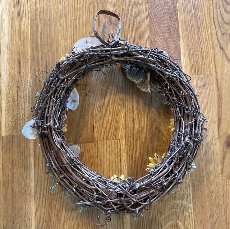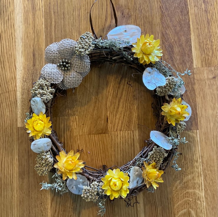 A one-off design to cheer a little spot in your home this Autumn and Winter! This 20cm diameter wreath has been made from flowers grown and dried in my Suffolk garden and arranged on a woven vine twig base. There are yellow Helichrysums, Achillea, Honesty and fragrant Thyme. A hanging loop is attached.