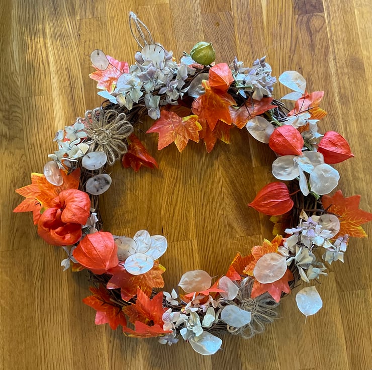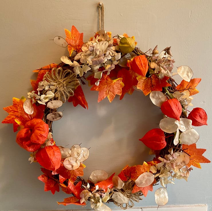 Halloween Lanterns - a one-off design to brighten up a spot in your home this Autumn and Winter! This 32cm diameter wreath has been made using flowers grown and dried in my Suffolk garden and arranged on a woven vine twig base. There are artificial maple leaves and hessian daisies with natural dried Honesty, Hydrangea, and Chinese Lanterns. A hanging loop is attached.