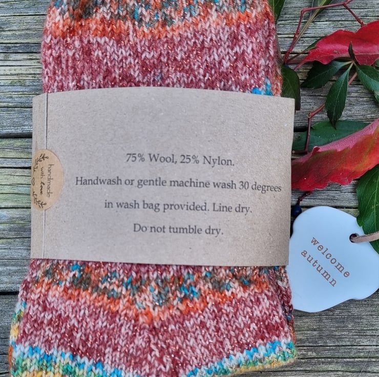 75% wool, 25% nylon, washable. These have a sparkling/glittering thread weaved through, very attractive. Washing instructions plus wash bag included.