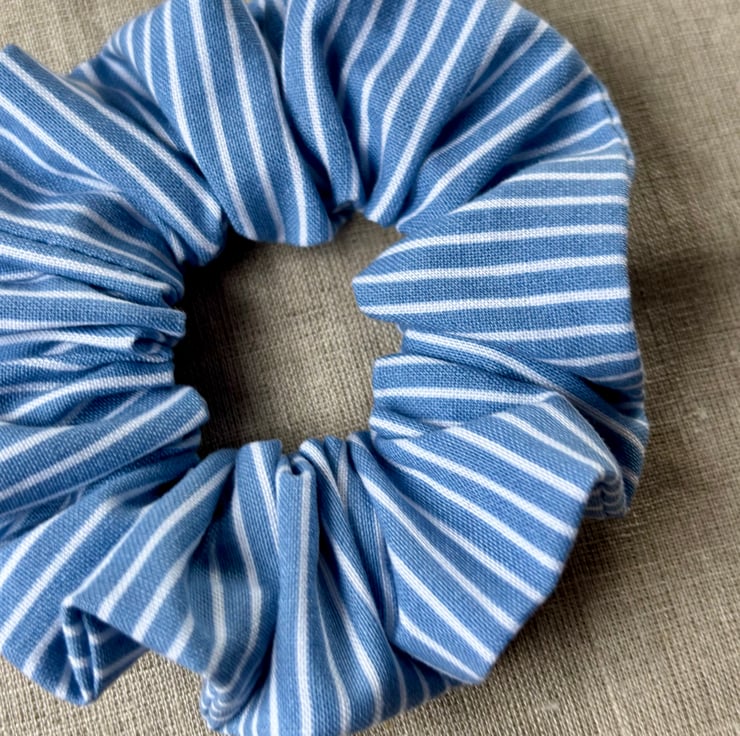 Medium sized scrunchie sewn from 100% cotton blue stripy vintage fabric.