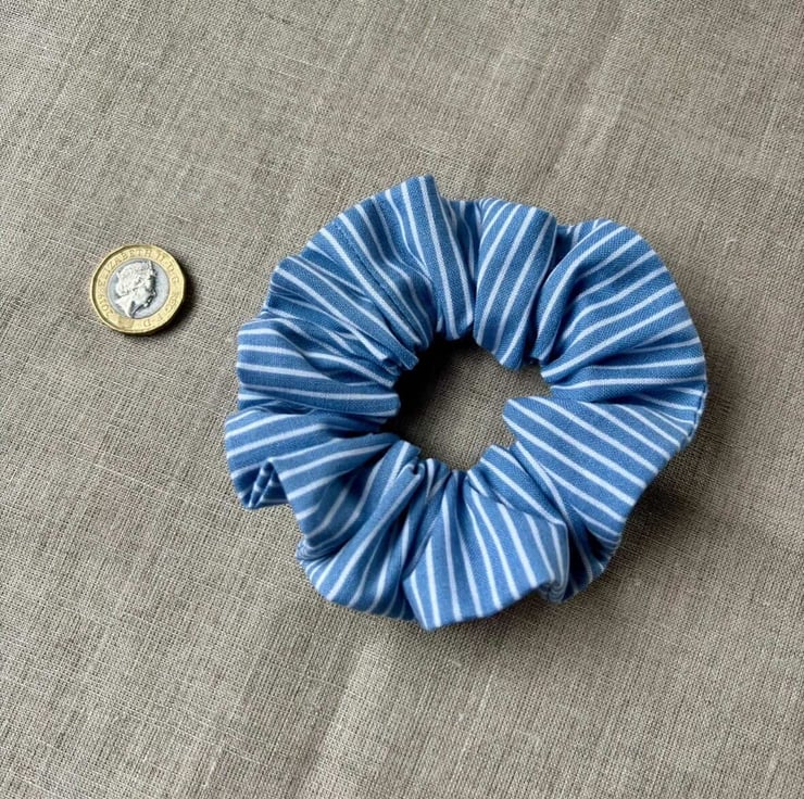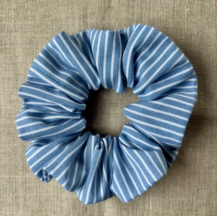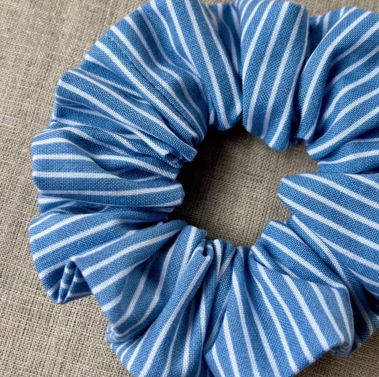 Medium sized scrunchie sewn from 100% cotton blue stripy vintage fabric.