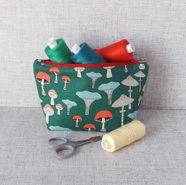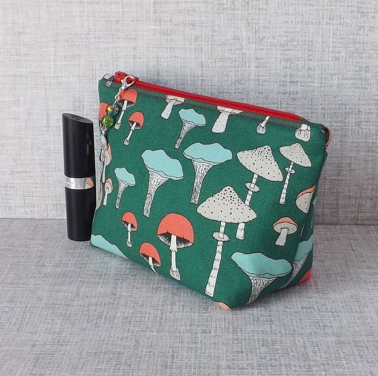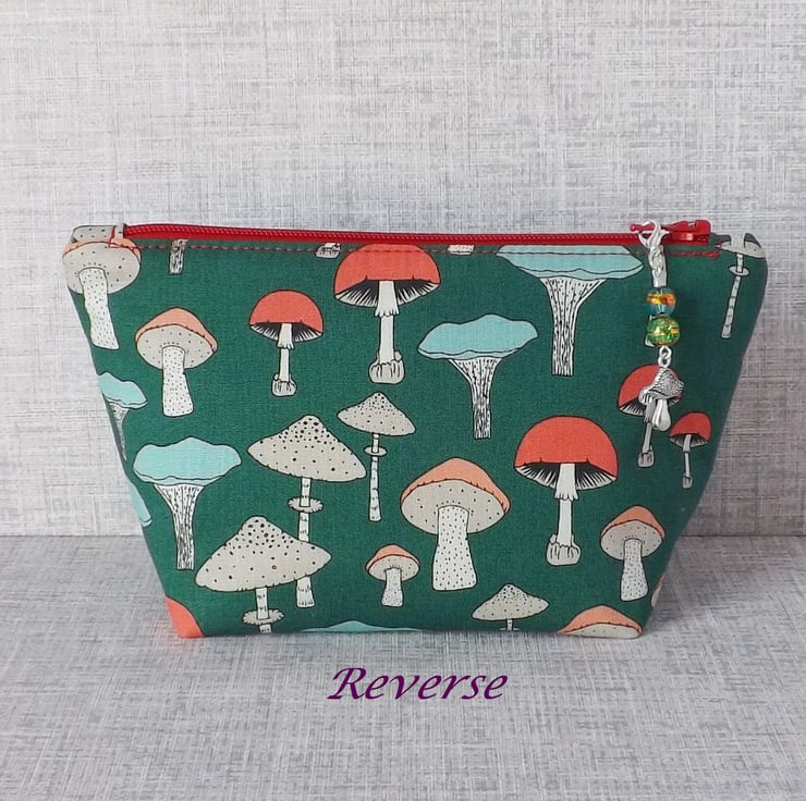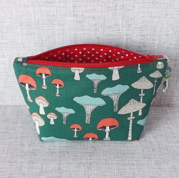 A medium sized make up bag made from a lovely cotton fabric with a mushroom design in red, blue and grey on a green background. The lining is a red with white spots cotton fabric.