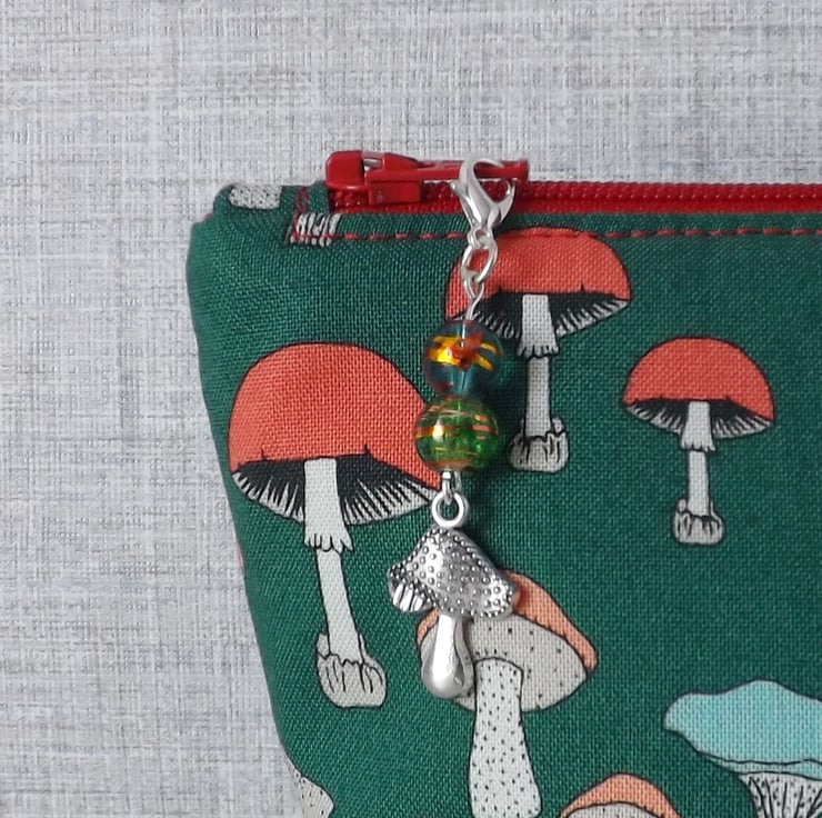 All the fabric has been backed with interfacing to give body to the bag, and there is a zip closure on the top with a mushroom & bead charm on the zipper pull.
