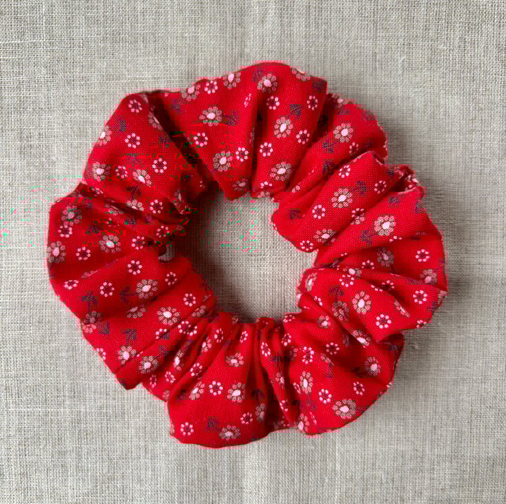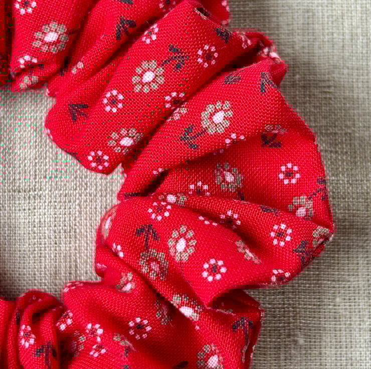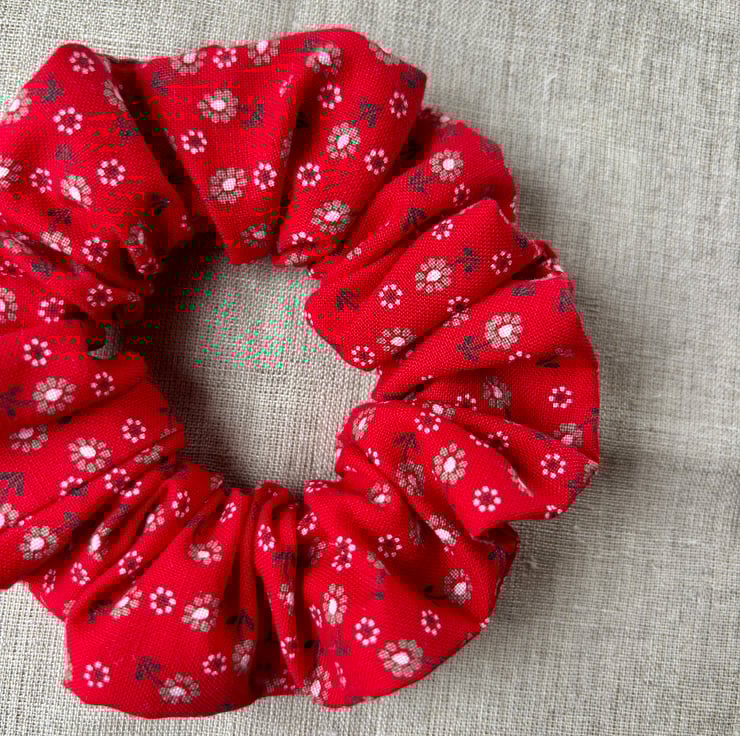 Medium sized scrunchie sewn from 100% cotton red floral vintage fabric.