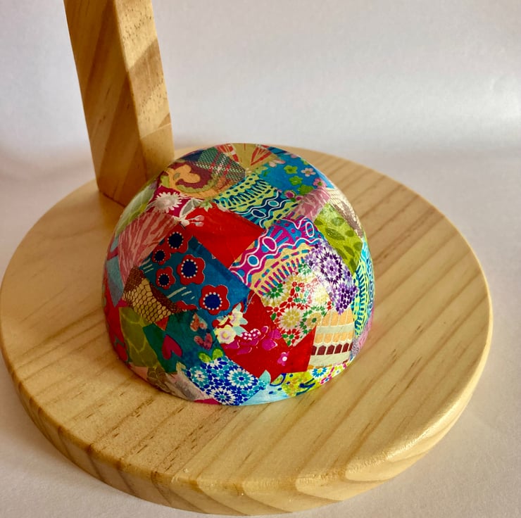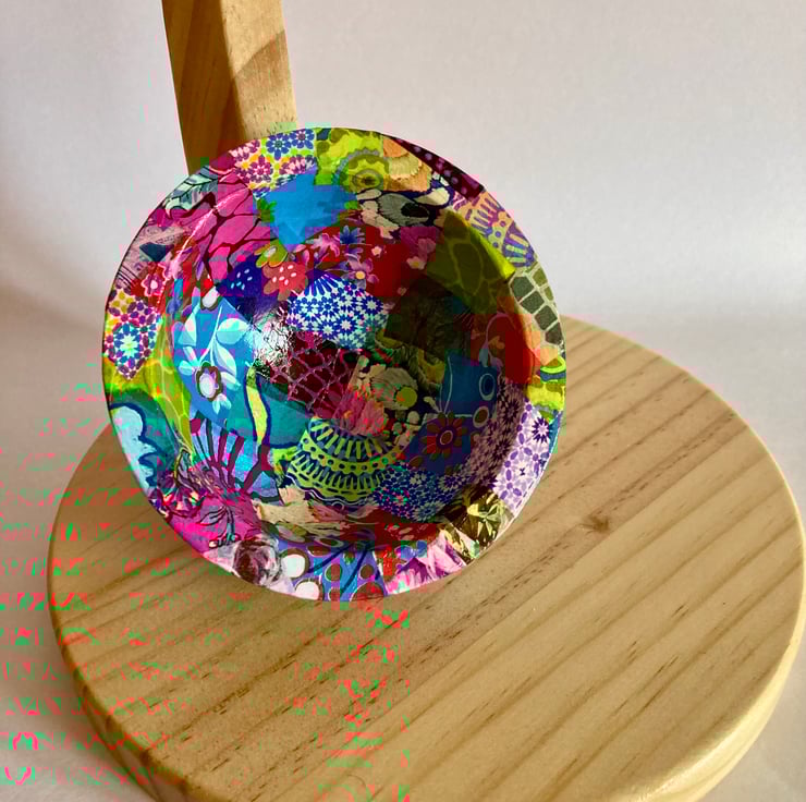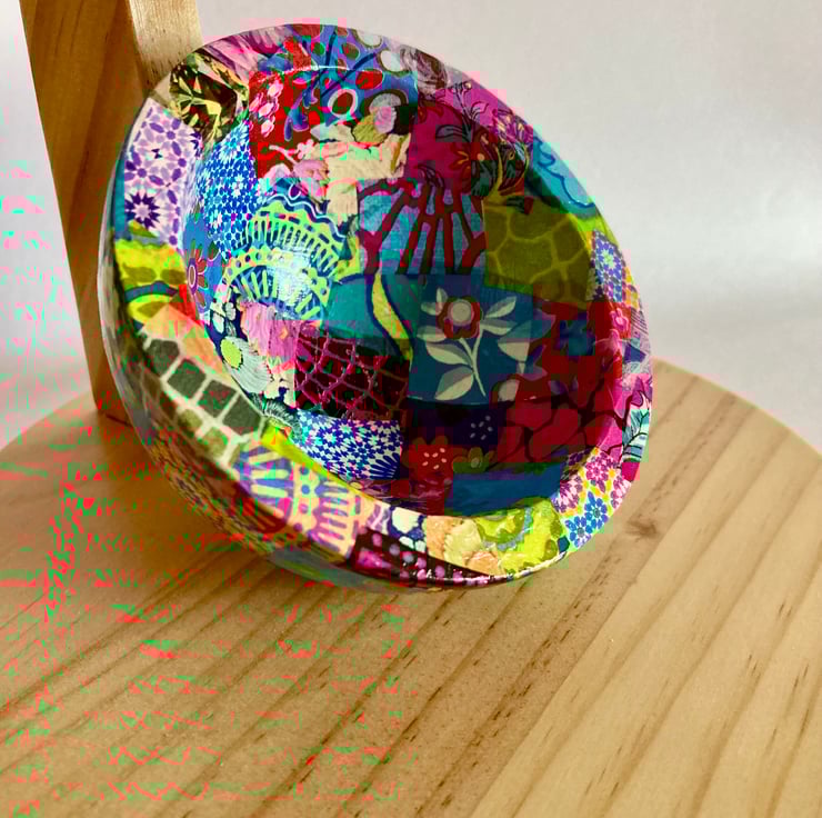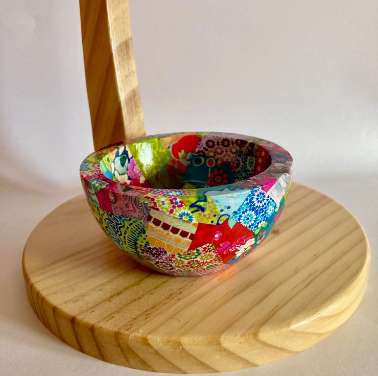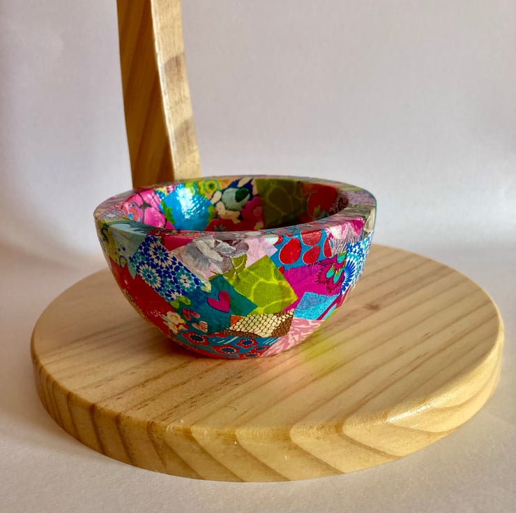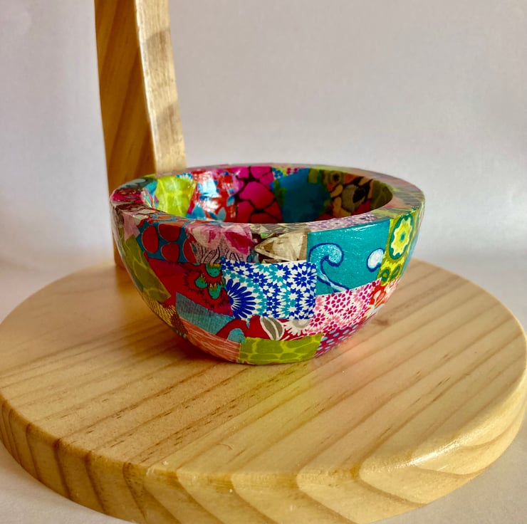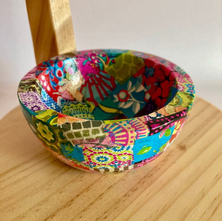 This wooden bowl has been up cycled and turned into a pretty colourful decorative bowl.