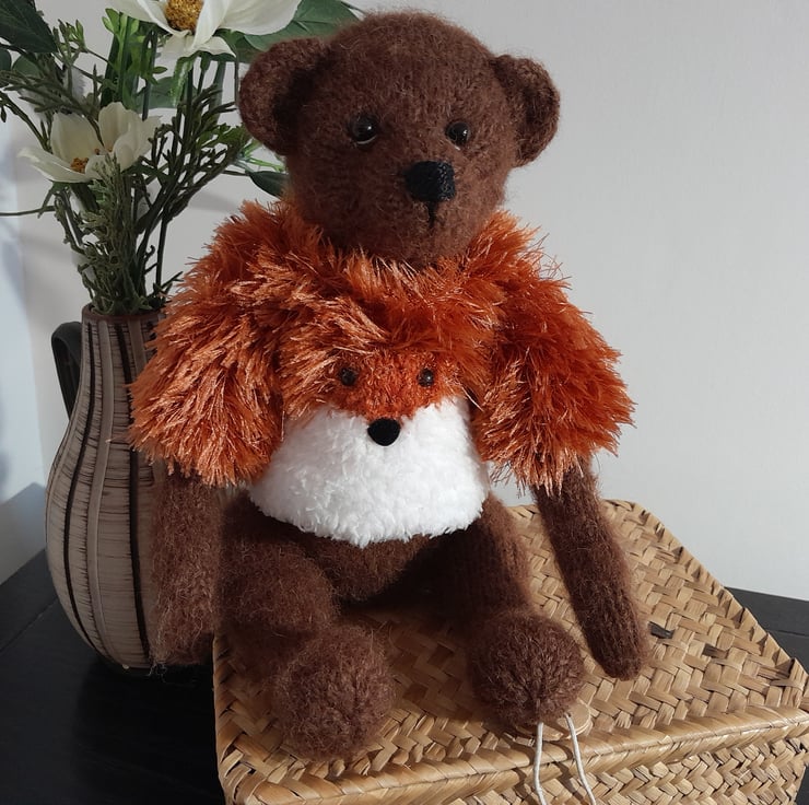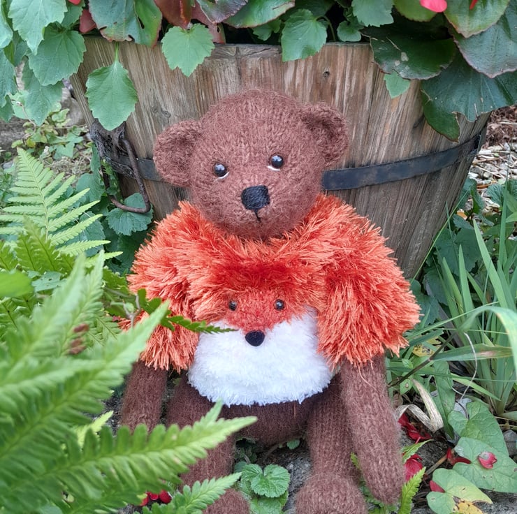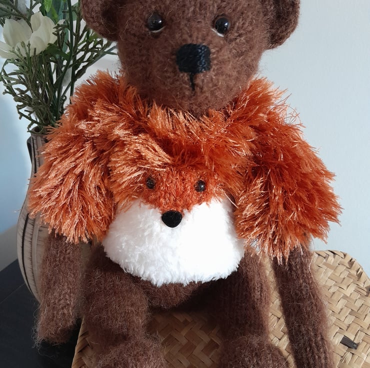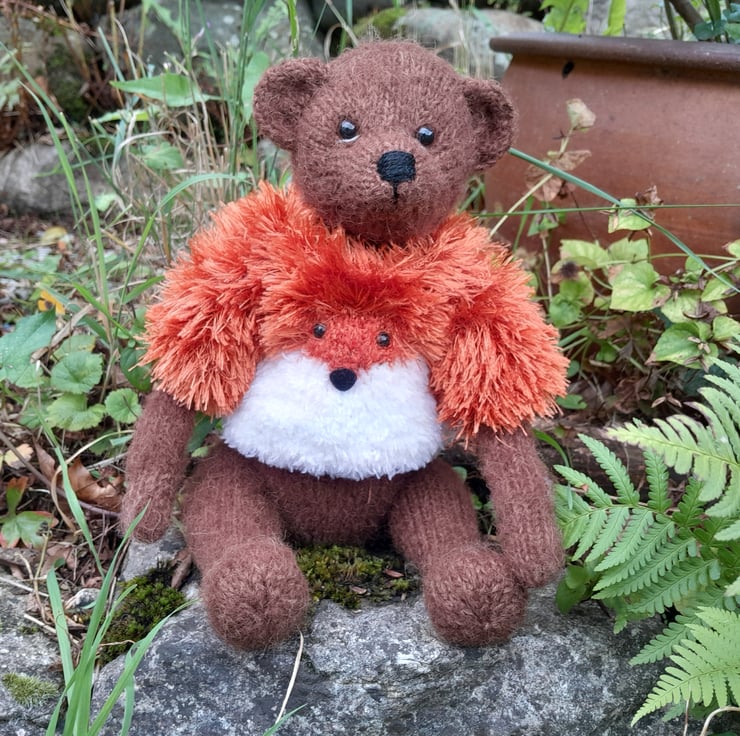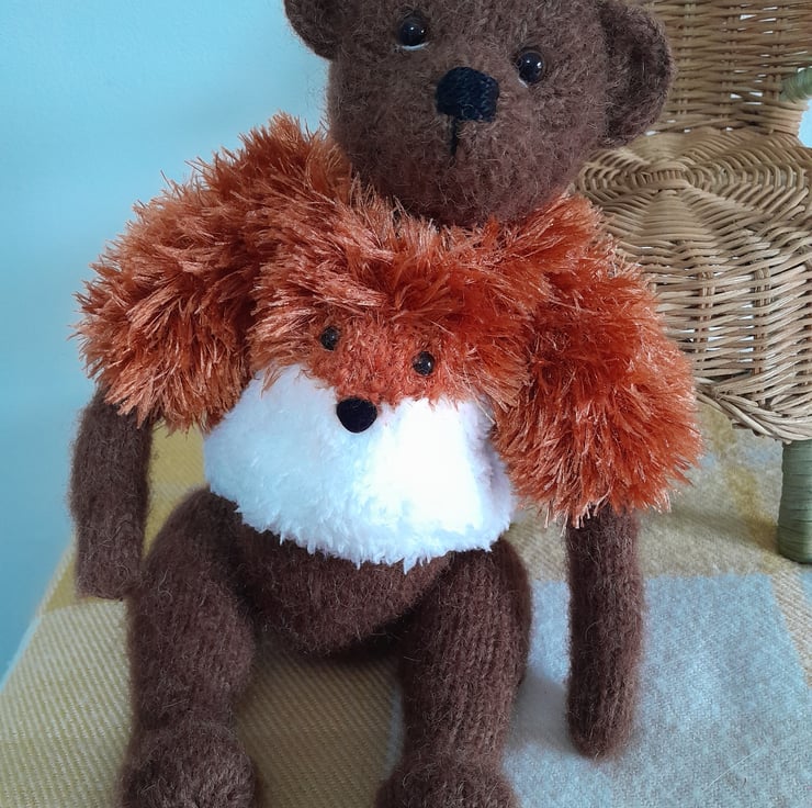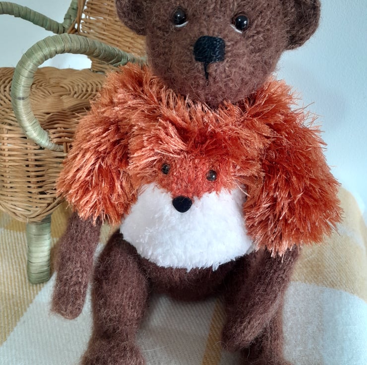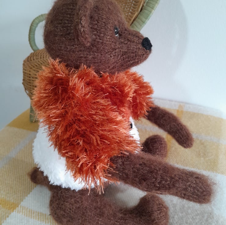 My latest bear is a real foxy lady. She measures 10" (25cm) sitting and is knitted in two dark chocolate yarns in alpaca and brushed mohair. And for extra fluffiness I have given her a gentle brushing.