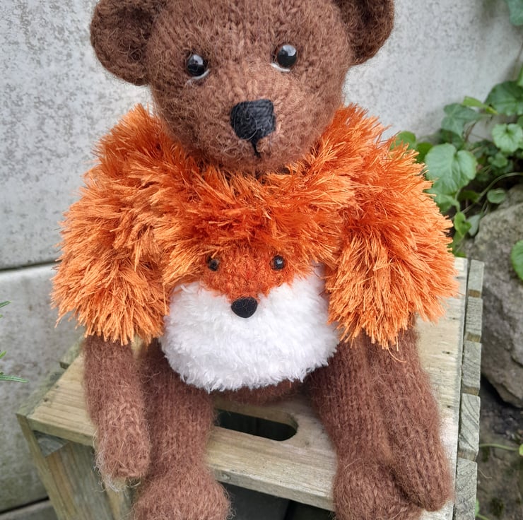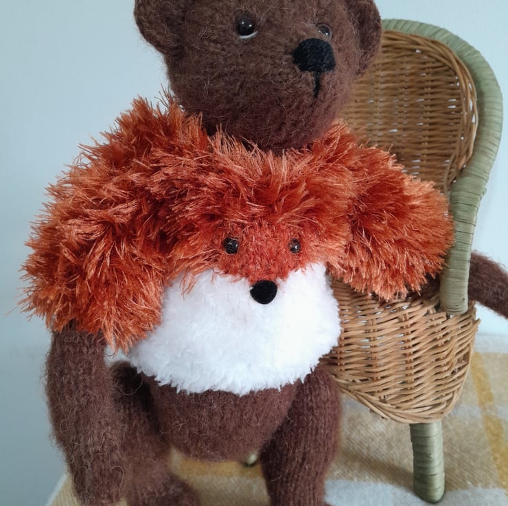 Her jumper is knitted in an ginger eyelash and a white velour yarn. And has an embroidered fox face.