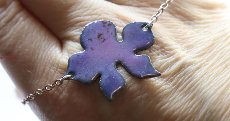 This bracelet was created using traditional jewellery making techniques. The copper flower shape was hand-sawn out of copper sheet. It was then coated in purple enamel, counter-enamelled and fired in the kiln. It is connected with a gold plate chain and fastened with a safety catch and eye. The bracelet measures 18cms in total length.