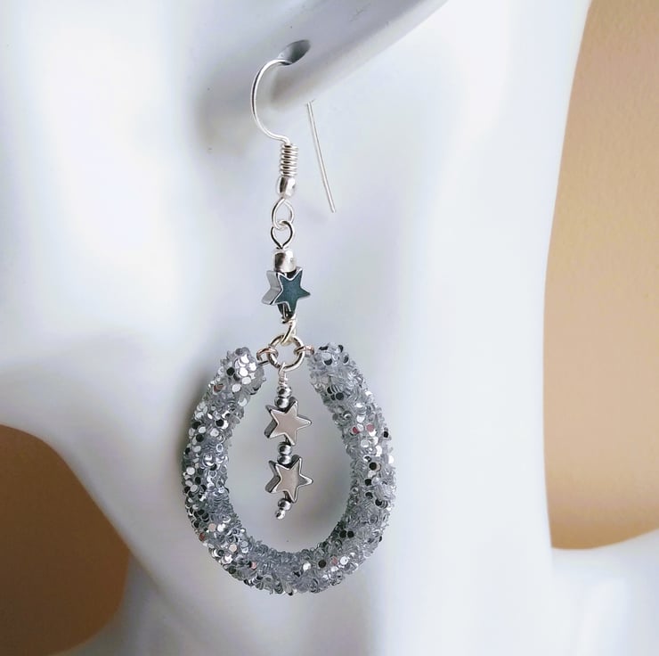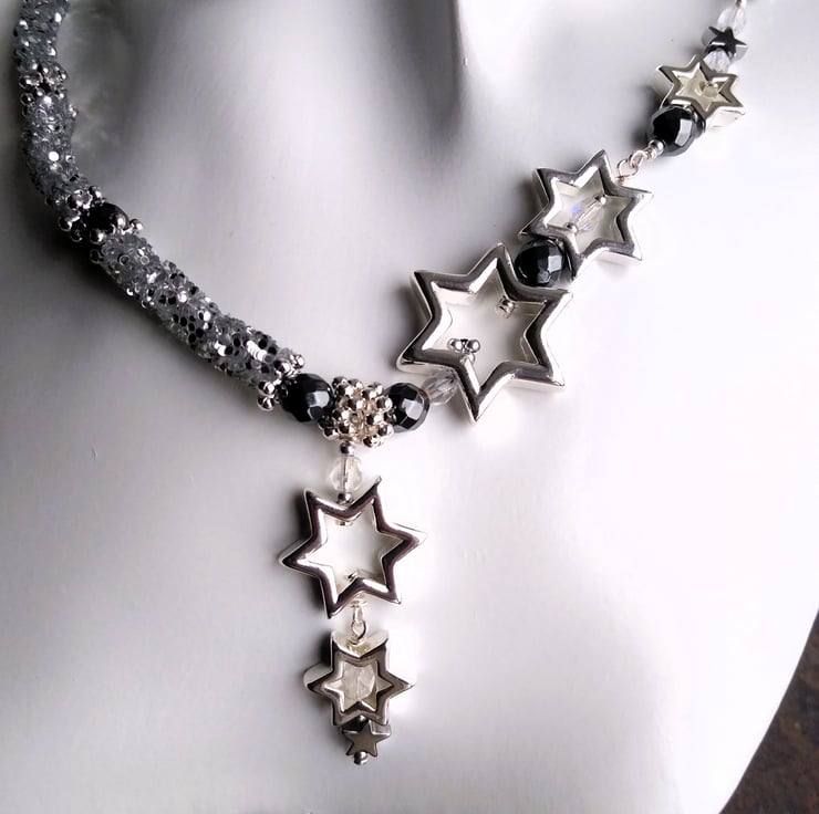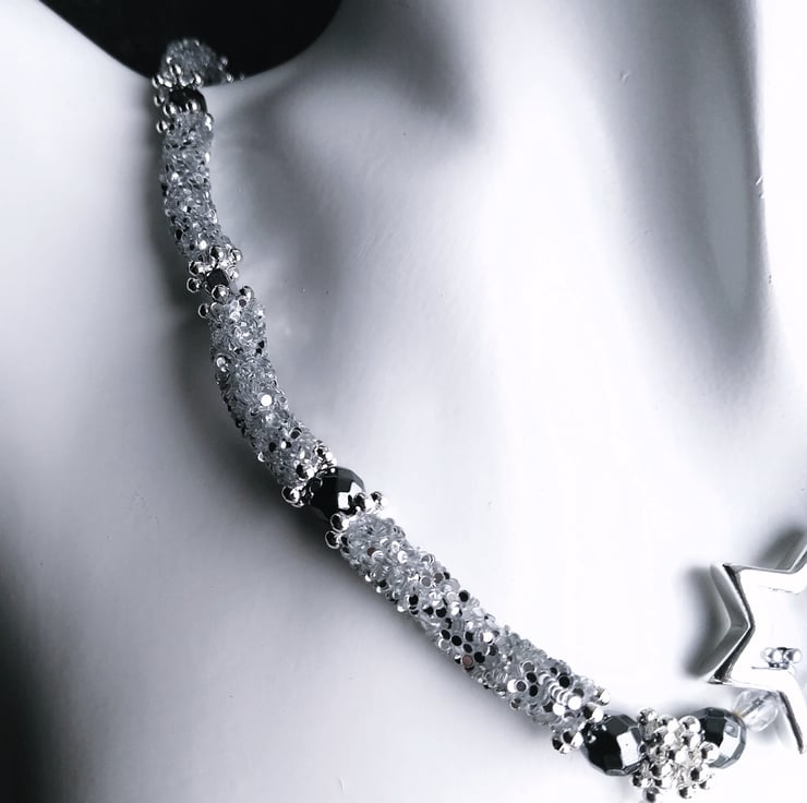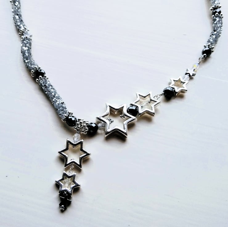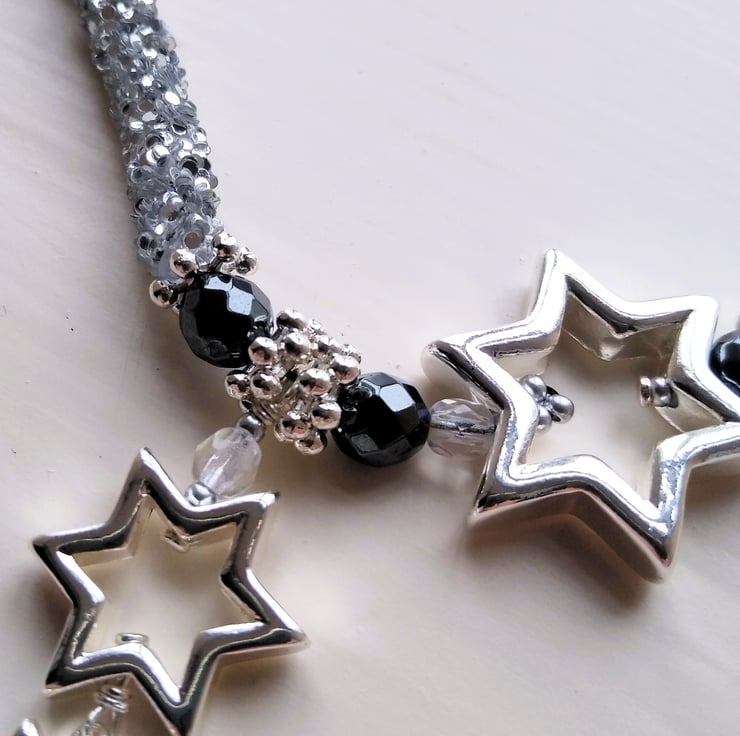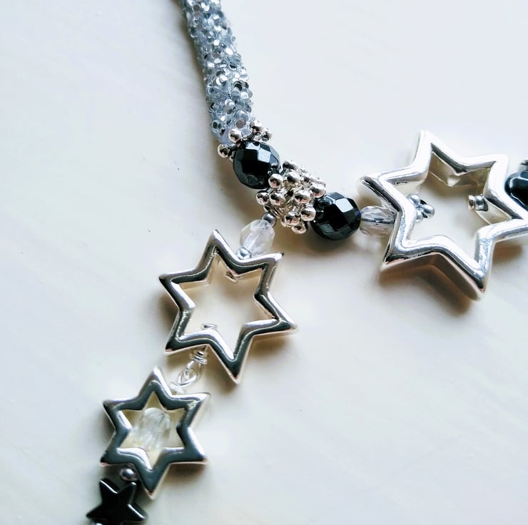 Elevate your look this season with this enchanting celestial necklace and matching earrings gift set. Handcrafted with shimmering silver glitter tube beads, that twinkle like a galaxy, contrasted with gunmetal and black hematite gemstone beads and a constellation of lustrous silver plated metal star shaped beads, tumbling in size like a shooting star. This necklace comes with matching silver plated silver glitter tube loop earrings with dangling gunmetal Hematite star beads.