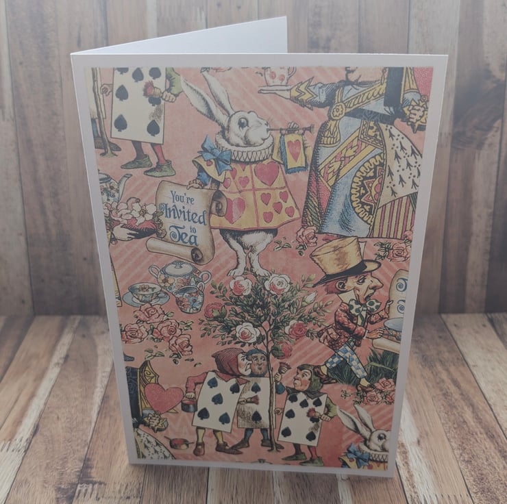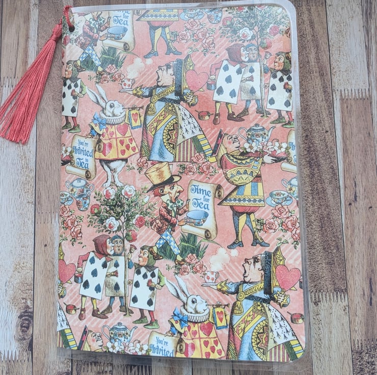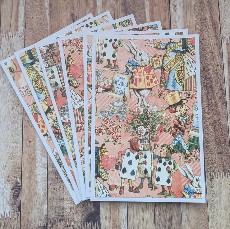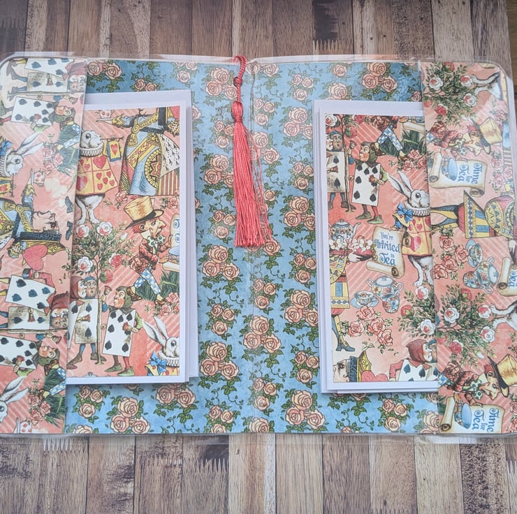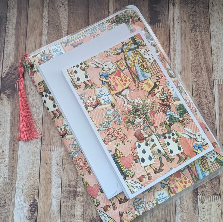 Step into a world of whimsy with this charming Alice in Wonderland stationery set featuring a coordinating folder with tassel detail and matching note cards. This set captures the magic of tea parties, the White rabbit playing cards and The mad hatter.