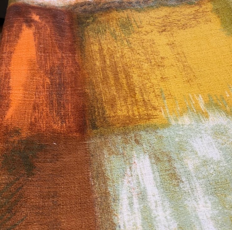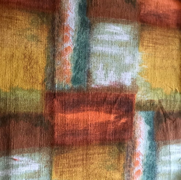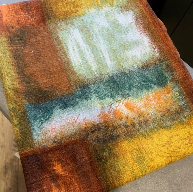 Vintage Barkcloth - 1950's Abstract Pattern in Green, Orange, Yellow and White, this is an off cut from a curtain, please check out all of the pictures as they form part of the description.