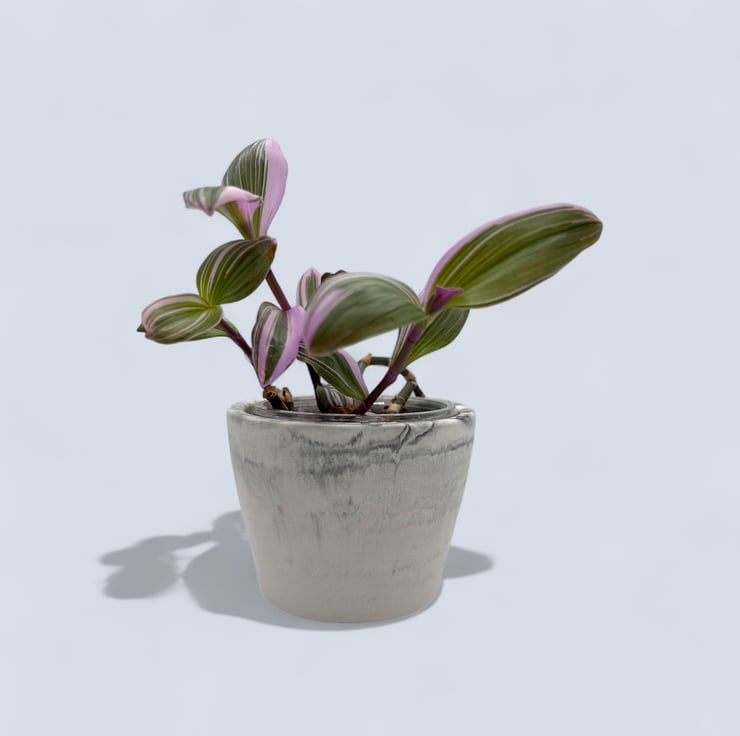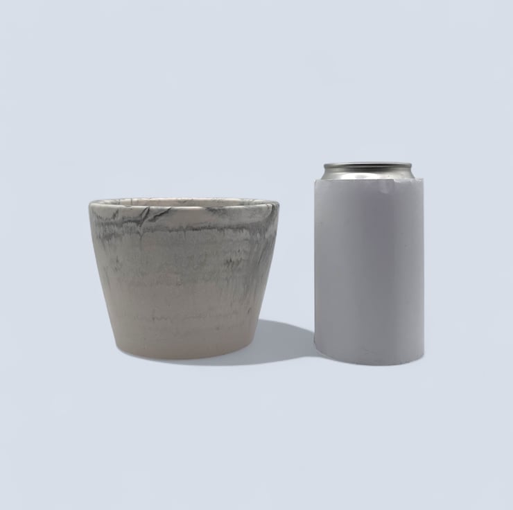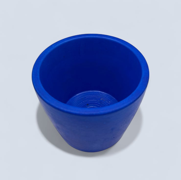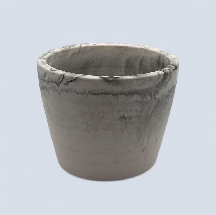 Handmade tapered plant pot with a top outside diameter of 12 cm, inside diameter of 10 cm, and height of 9 cm. This modern stone effect planter is available in a choice of colours including grey, blue, white, black, pink, yellow, green, and marbled finishes.
