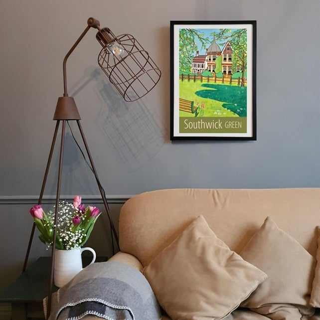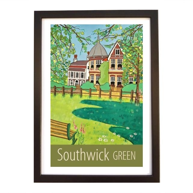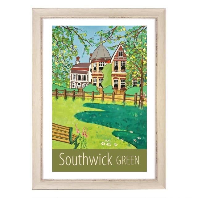 A travel poster print of the view across pretty Southwick Green in Southwick, from my own original acrylic painting.