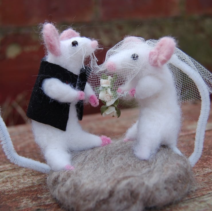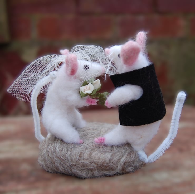 White mice bride and groom. Needlefelted using soft white wool fibre. The bride is holding a bouquet of white artificial flowers and is wearing a net veil. The groom is wearing a smart black waistcoat. The mice are attached to a grey wool fibre base.