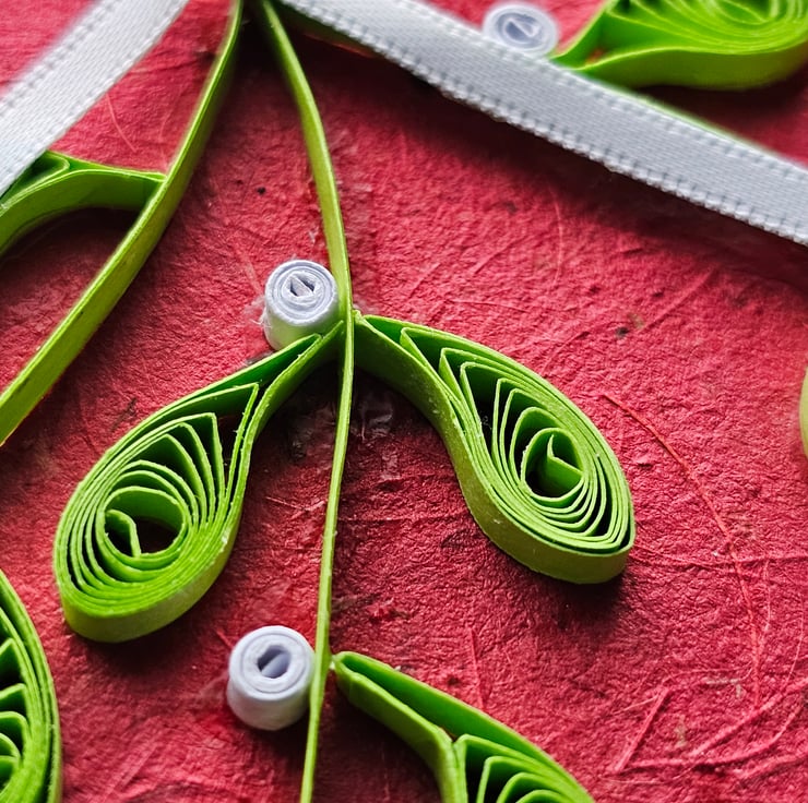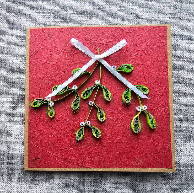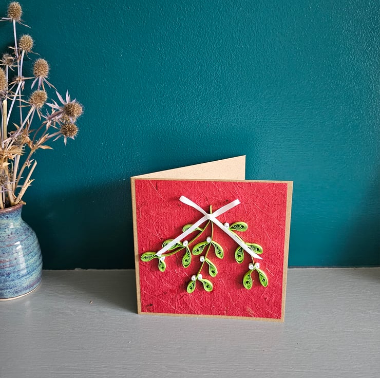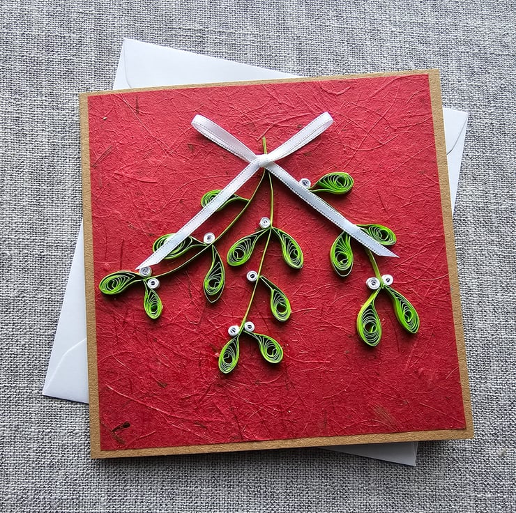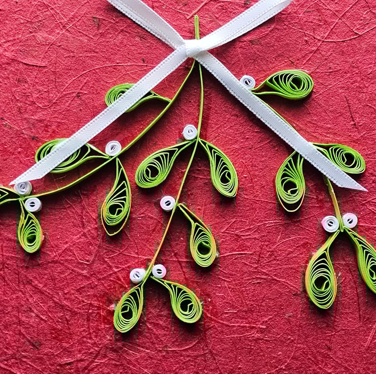 Mistletoe that will keep for more than one season! A unique handmade card featuring quilled mistletoe. Paper quilling is a technique where strips of coloured paper are used to make an endless variety of designs. The card is left blank for your own message. It can be used for Christmas or New Year wishes and also as a decoration to decorate your home during the festive season.