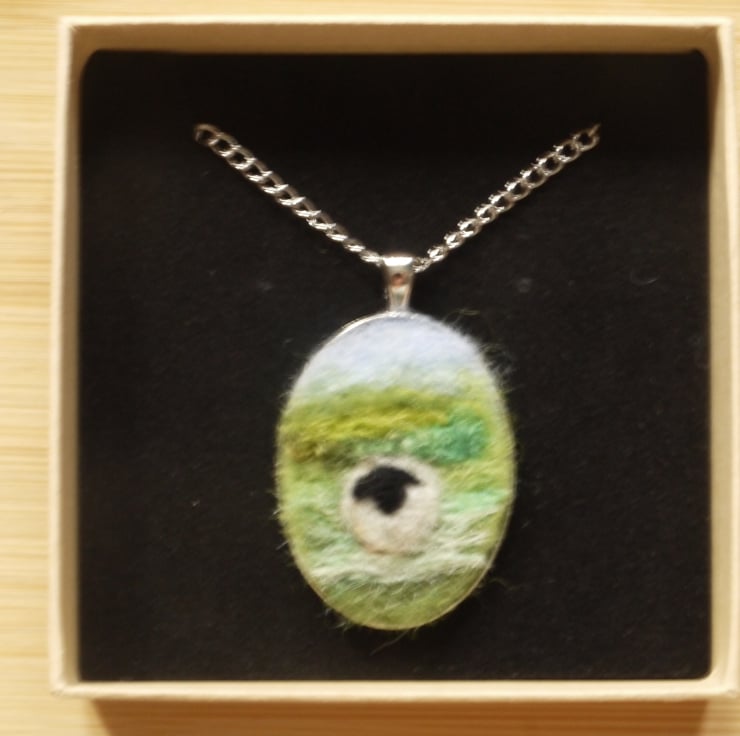Pretty white metal chain oval shaped pendant featuring a needle felted spring landscape design with a sheep. Our pendants all have a chain length of 16 inches / 41 cm and are silver metal. The needle felted design is made with a mix of natural and dyed wools along with silk fibres and wool locks and are all unique, one off designs.