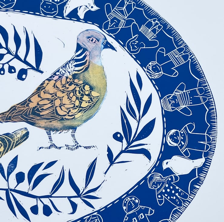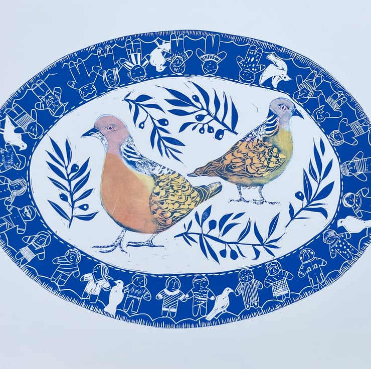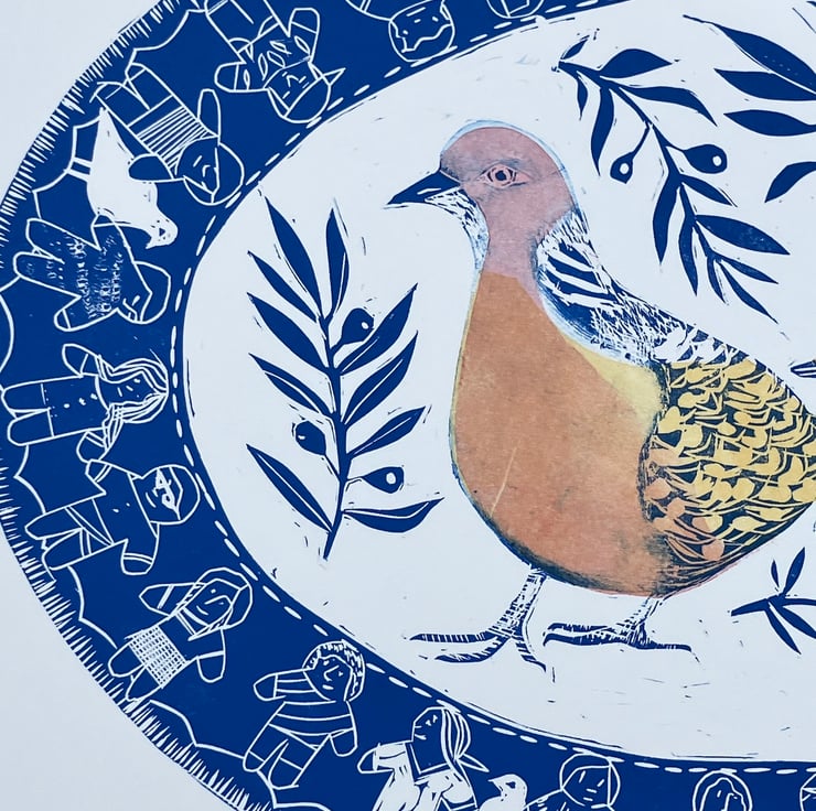 Multi colour Lino cut printed on Somerset buff 250gms . Original design produced to raise money for War Child UK