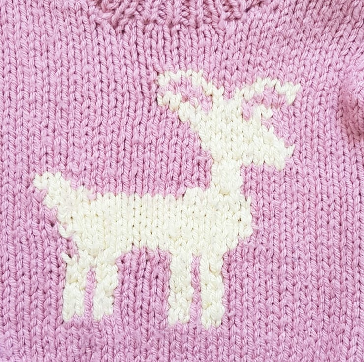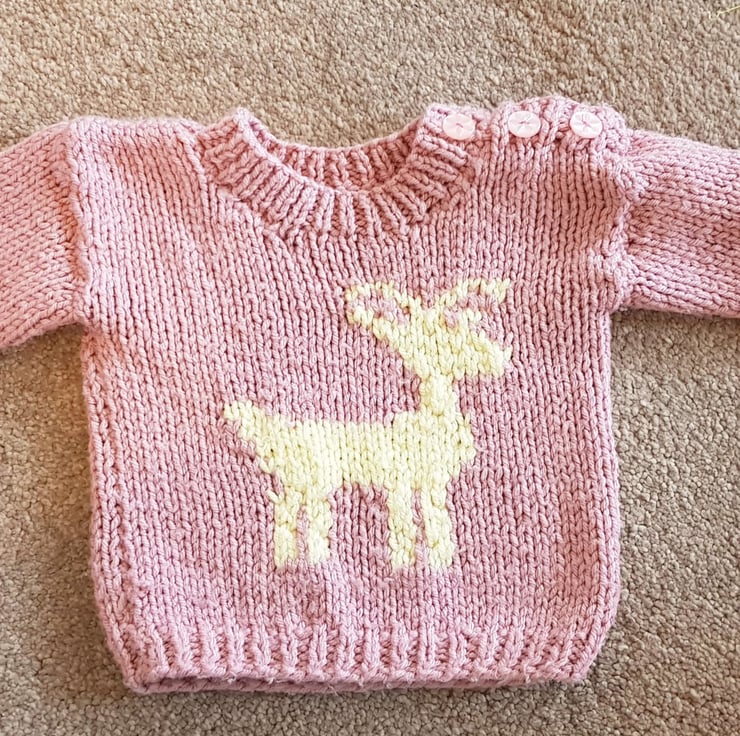 A really cute hand knitted round neck chunky knit jumper, with a deer motif, for children up to 3 years made using chunky yarn to give the jumper to make it warm for chilly days. It is not currently in stock but it can be made for you in a size and colour of your choice. Please see below for the available sizes and prices and state the colour required when you order. Please allow approximately 2 weeks processing time for the jumper to be made and posted to you.