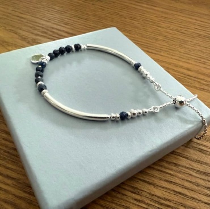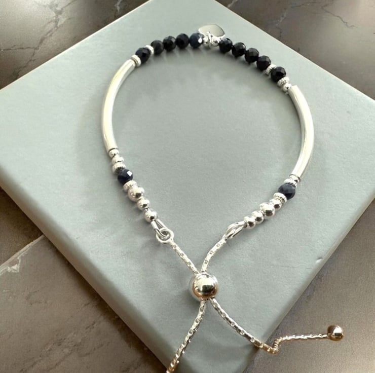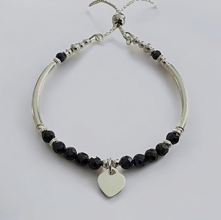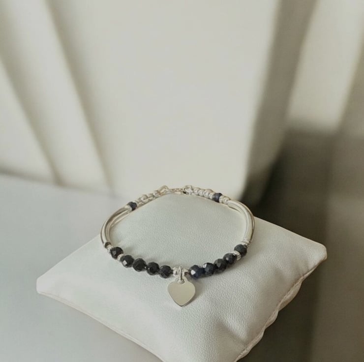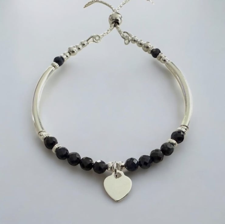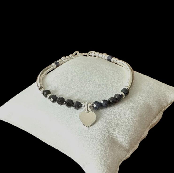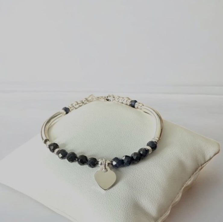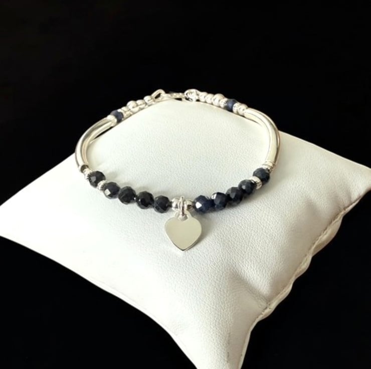 A timeless and elegant bracelet made with deep dark blue 4mm faceted sapphire gemstones and finished with a sleek sterling silver noodle design. A Sterling Silver heart charm adds a touch of romance and meaning, making this piece as special as the person who wears it. I can personalise the heart charm with one initial letter, please send me a message if you would like the heart charm with an initial.