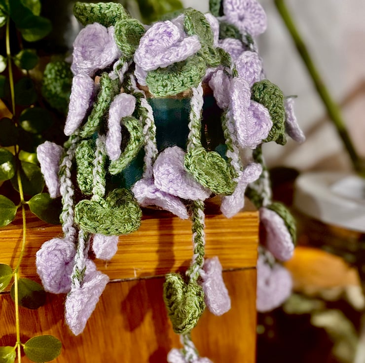 This product is made using a sage green and a purple yarn to mimic the natural colours of the string of hearts plant.