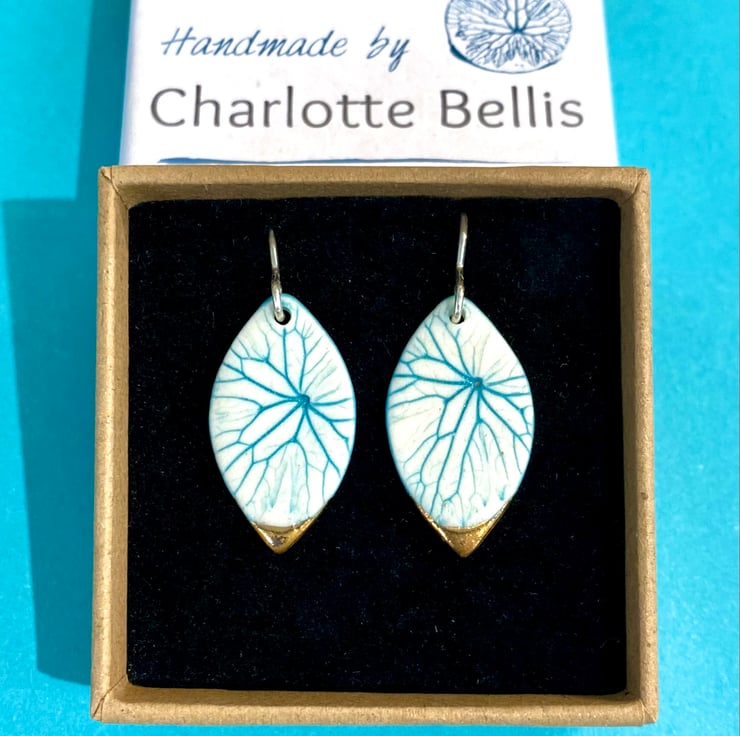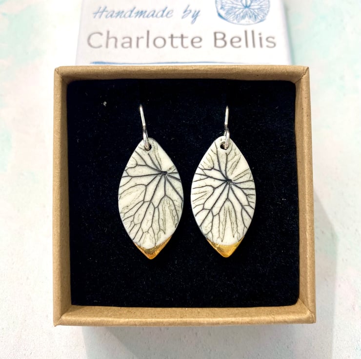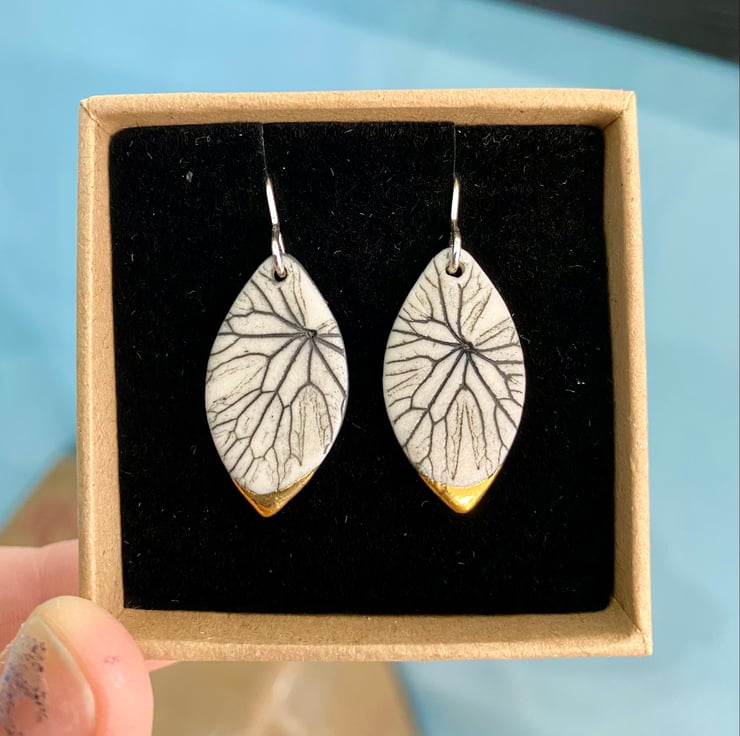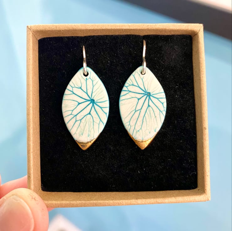 A leaf shaped earring with a pressing taken from a small leaf to create this delicate design with a 24ct gold lustre tip. Earring length is approximately 3cm with hook.